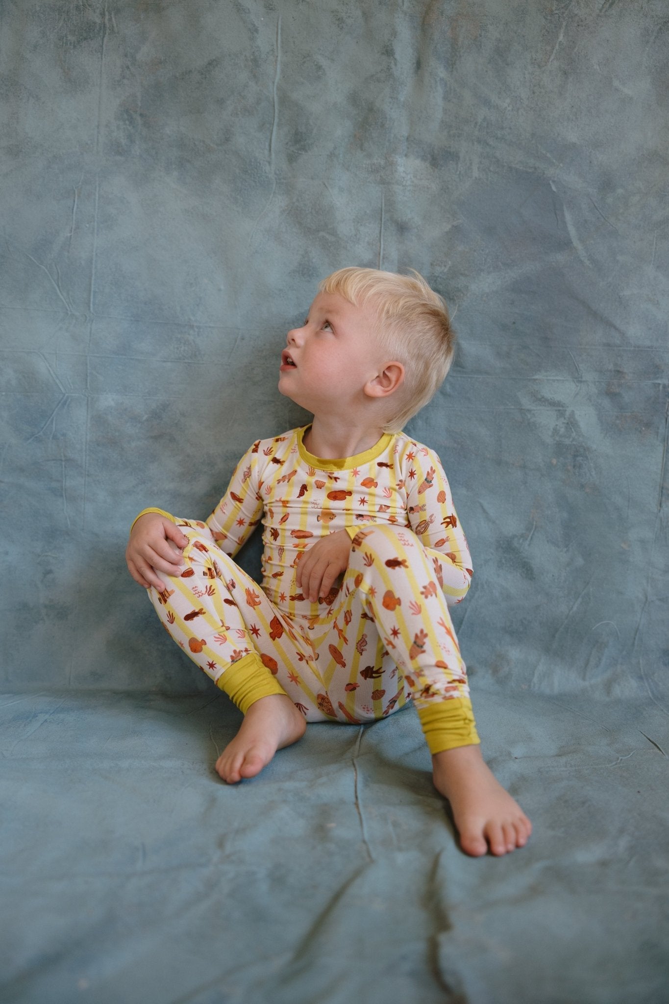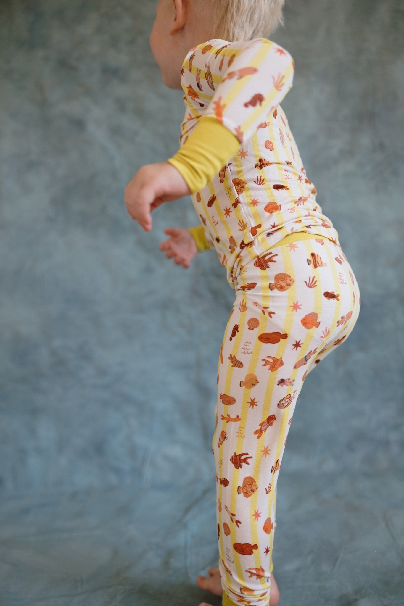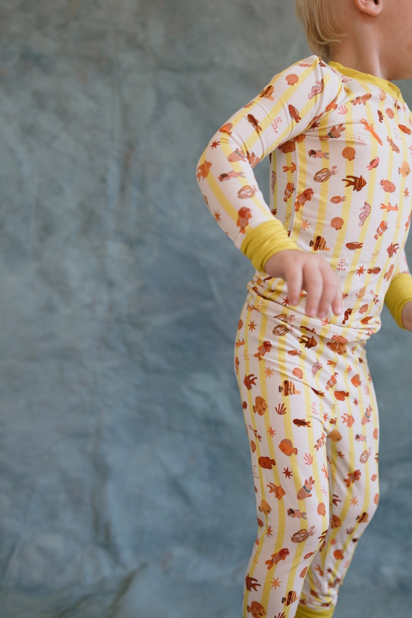 Our Fancy Fins Two-Piece Bamboo Pajama Set are made for dreamy seas and fancy fish lovers. Featuring our yellow stripe with fish print, this long-sleeve top and matching pants set is crafted from a premium blend of 95% viscose from bamboo and 5% spandex — breathable, buttery-soft, and stretchy for nonstop comfort.