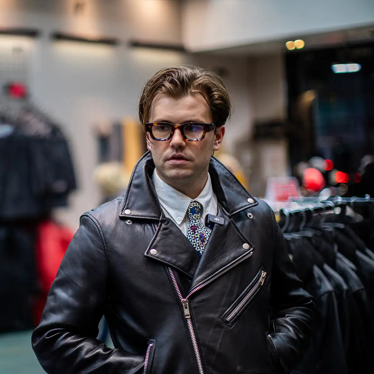 - Motorcycle style with snap down lapel collar and asymmetrical zipper