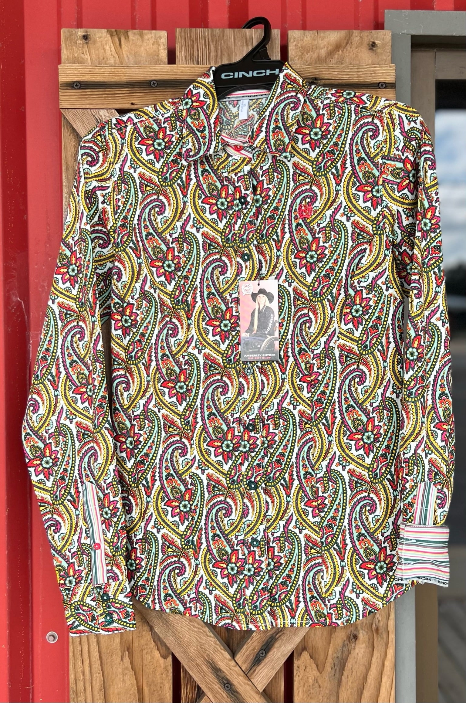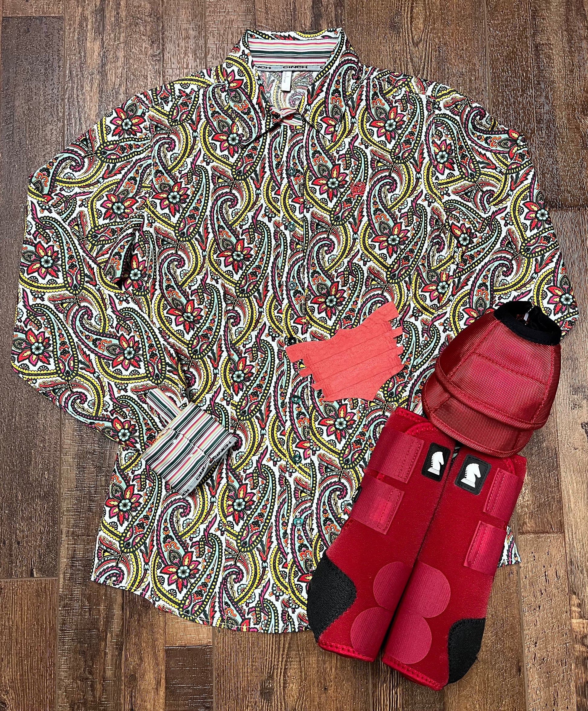 Women's long sleeve Cinch button up red, yellow, multi color floral paisley print horse leg boots and flair strip sold seperately