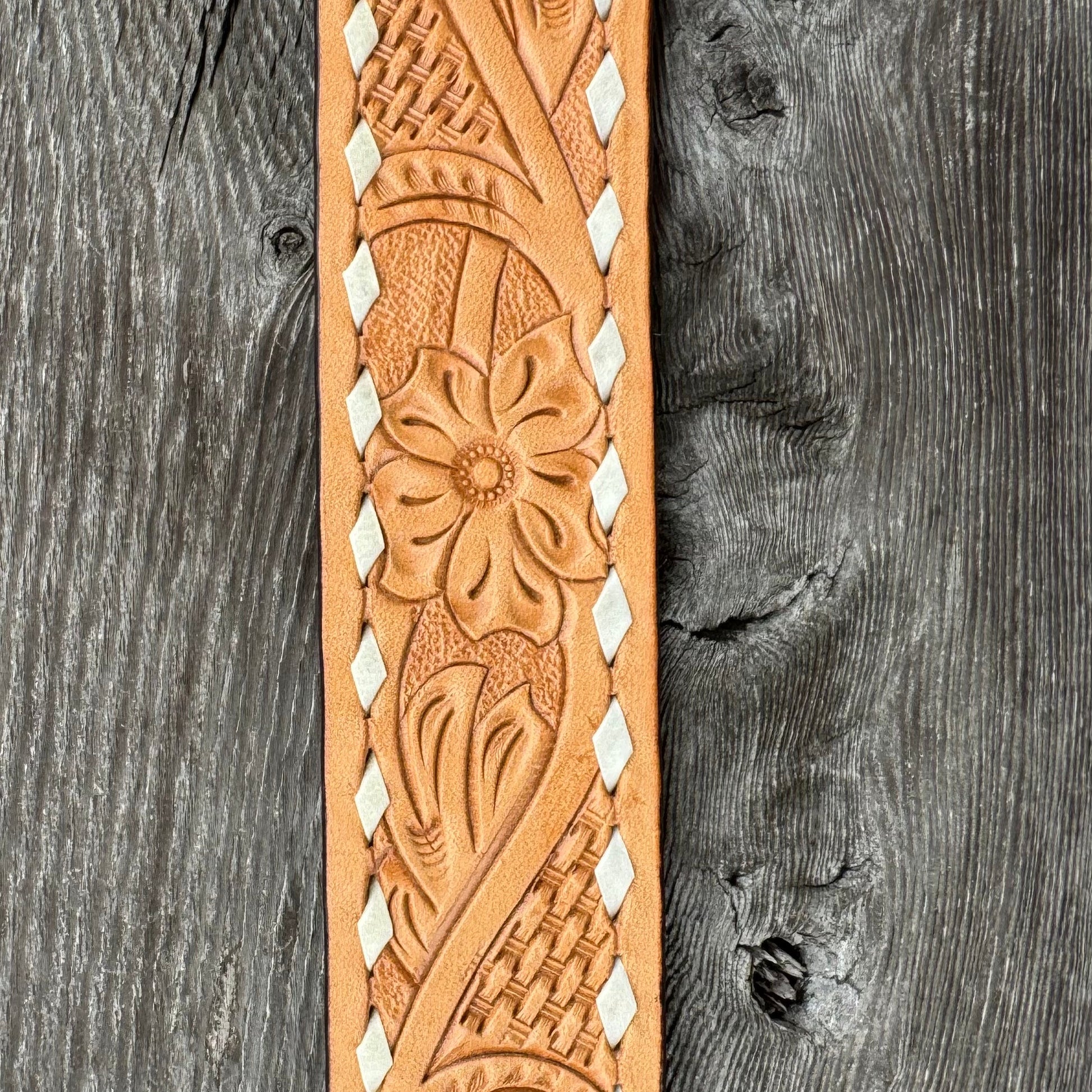 Challenger belt for both men and women in a light tan color with floral tooling and white buck stitching. 1 1/2" wide.