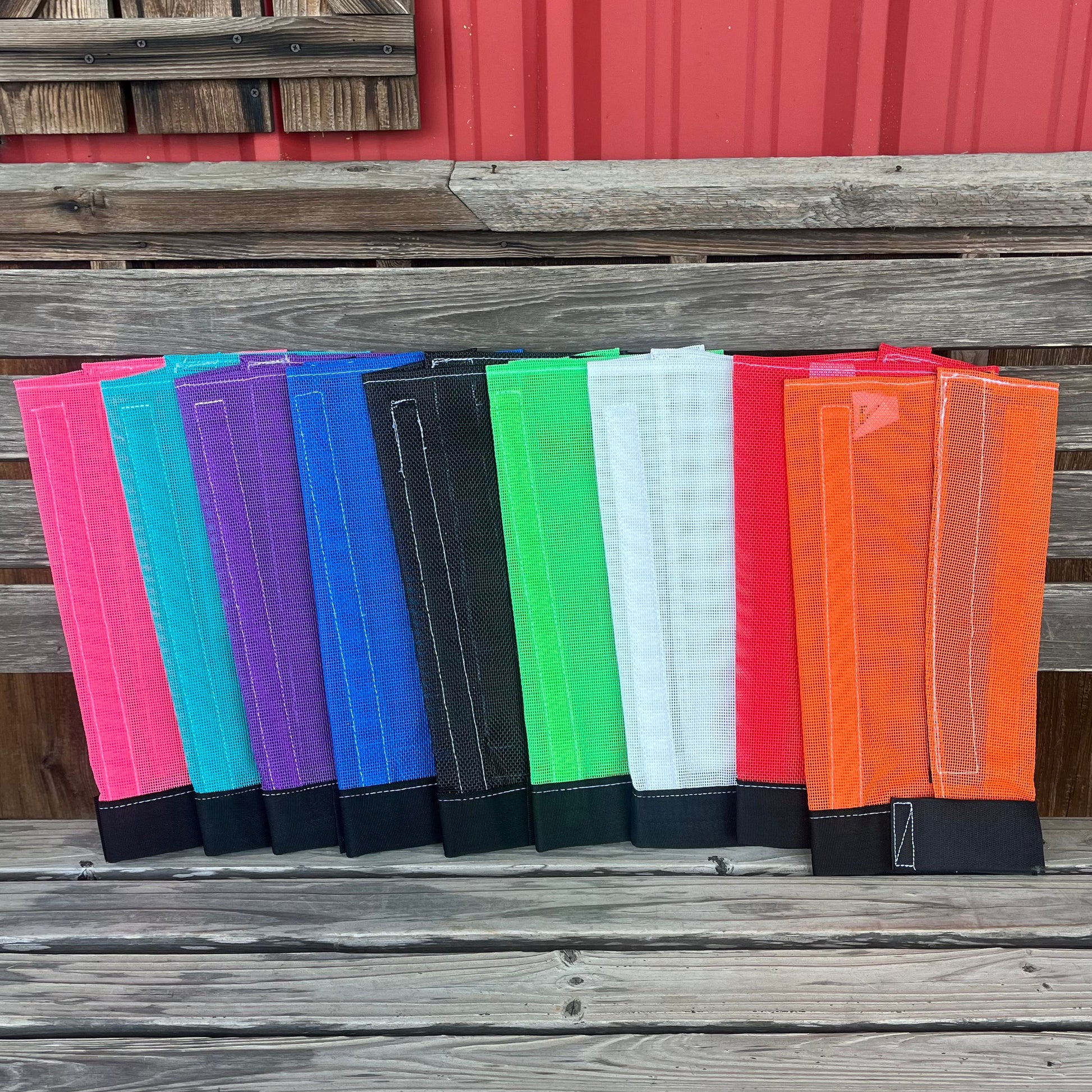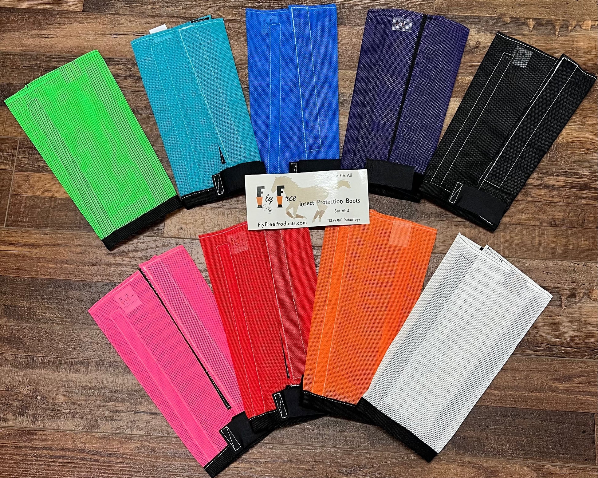 Leg boots designed to repel flies and reduce stomping and comes in packs of four.
