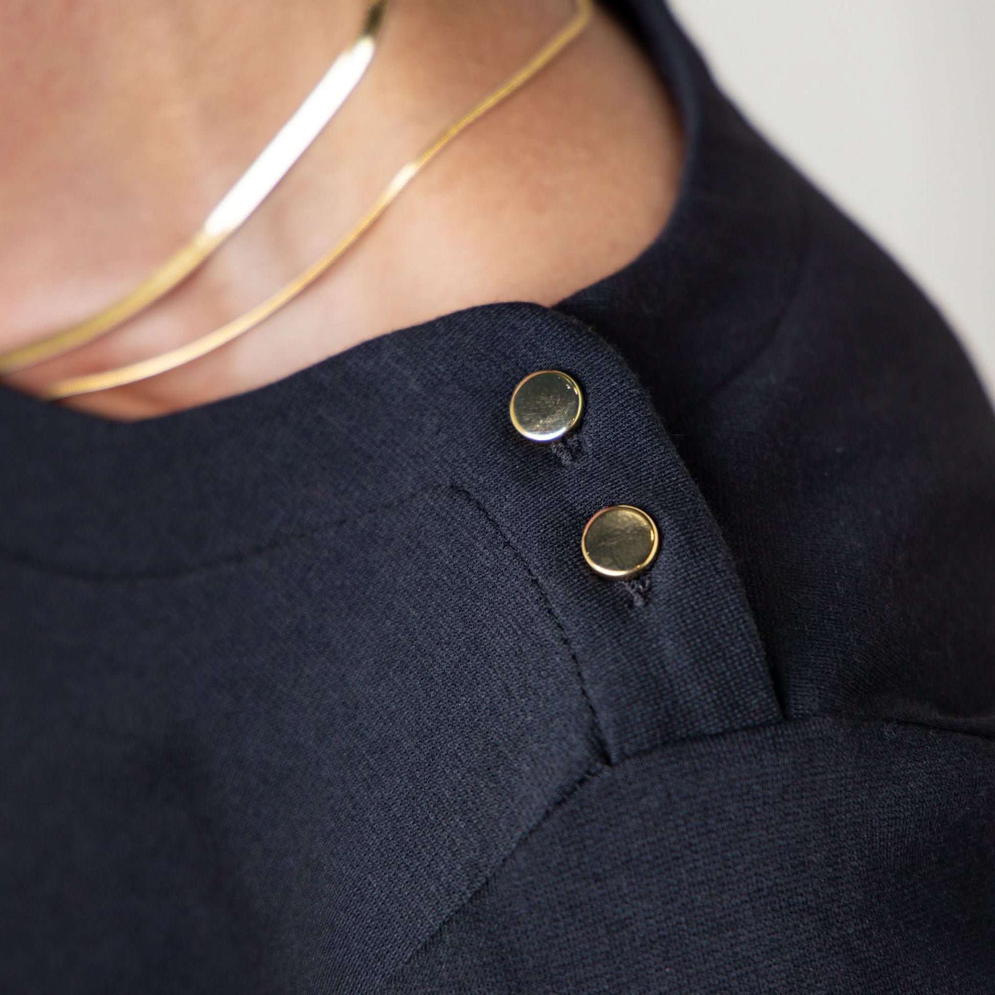 - Gold buttons at the shoulders and hidden zipper down the center back.