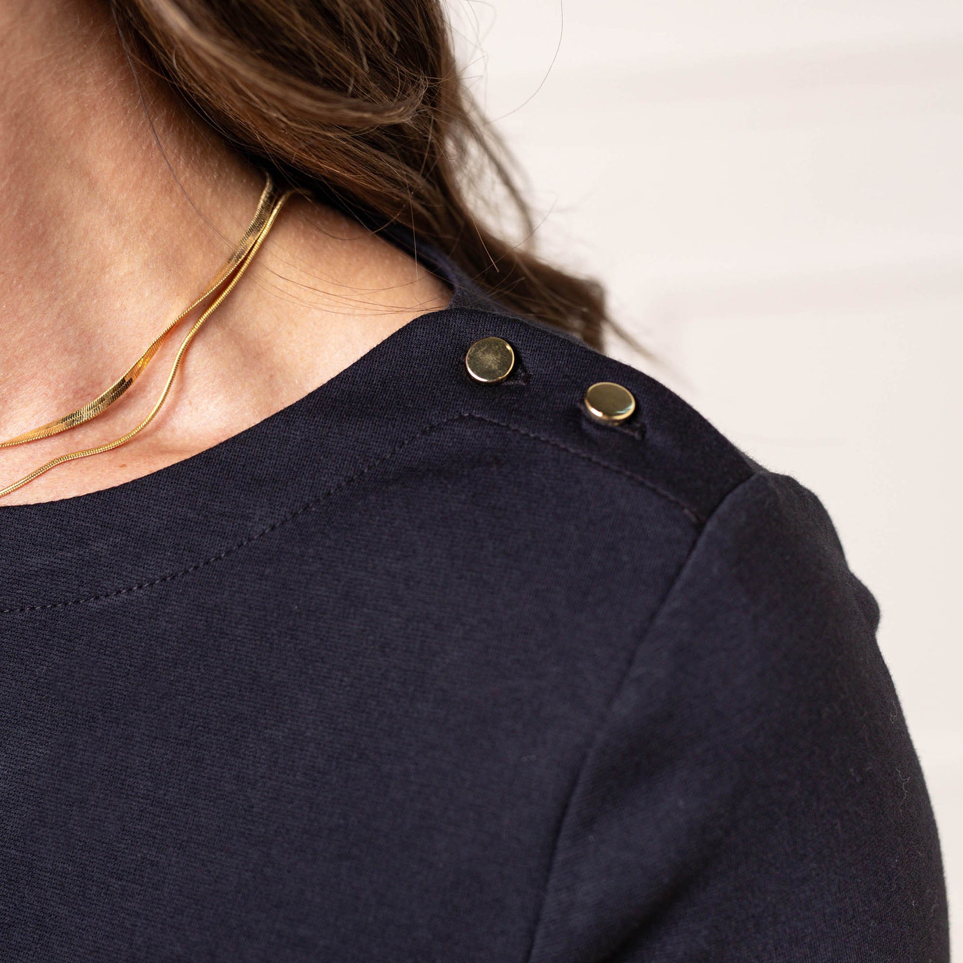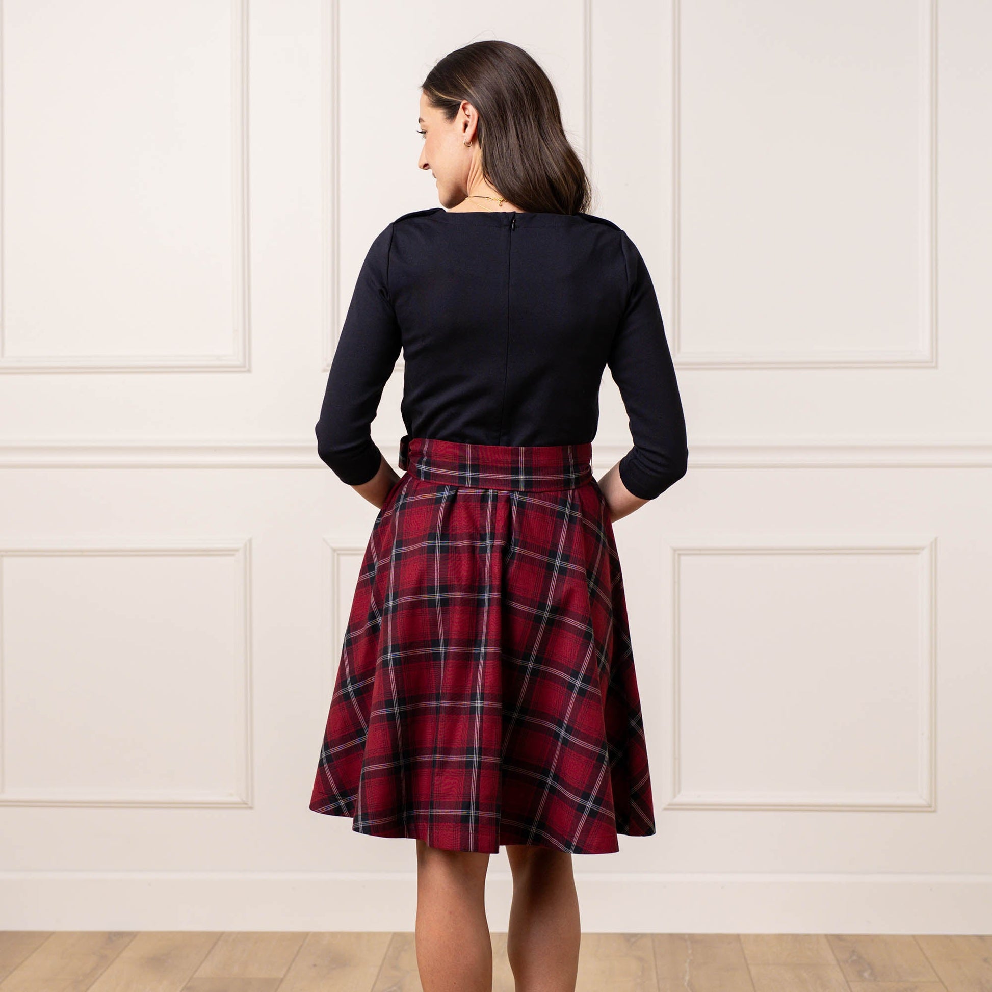 Strike a stunning silhouette in our classic mixed fabrication fit and flare dress with waist sash. Features a bodice cut from our substantial and soft organic cotton blend ponte knit paired with a woven skirt and sash. Center zipper down the back for easy dressing and gold buttons at the shoulders for just the right amount of shine. A dress for all occasions!