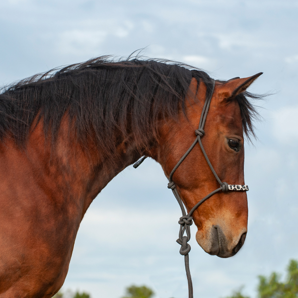 Beaded grey cheetach noseband rope halter with attached 9' lead rope