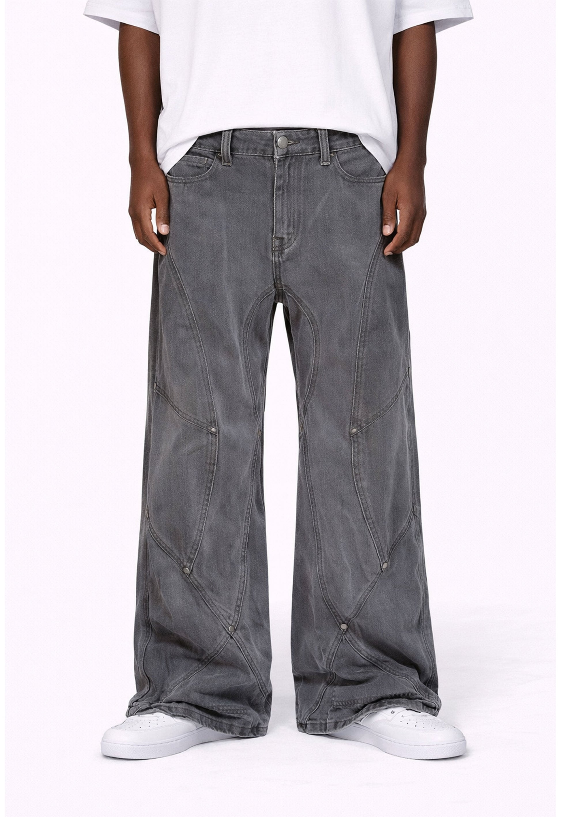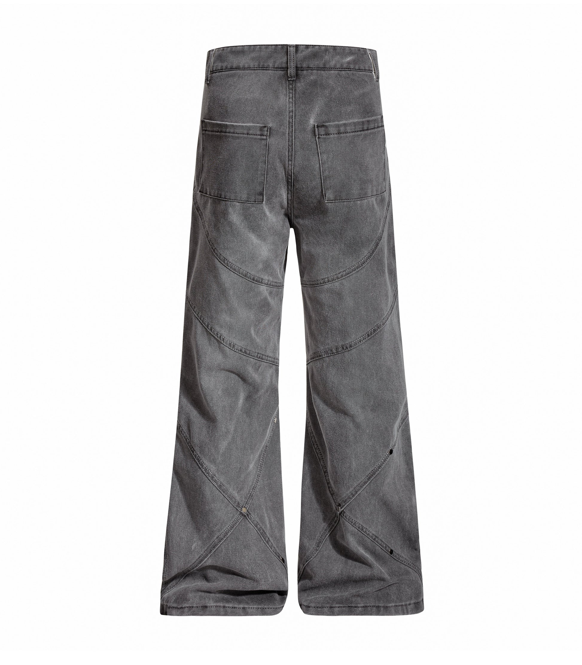 Our Grey Vintage Flare Denim are designed with a Flared fit, made with heavyweight Japanese Denim, an exposed zipper and panel, and a vintage wash finish.