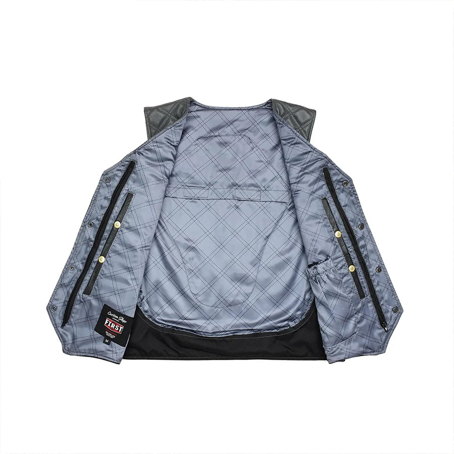 The Hammer Down Western-Style Men’s Motorcycle Leather Vest is crafted from 1.1mm diamond cowhide with grey leather double-diamond quilting on the front and back yoke. It features a Western-style V-neck with grey stitching, a four-snap front, and grey leather side lacing for an adjustable fit. Reflector piping runs along the center and outer edges for added visibility. Inside, the vest includes two concealed carry pockets with bullet snaps, a dedicated cell phone pocket, and CE-rated armor pockets designed for protection. A three-panel grey double-diamond satin lining with black background completes this durable and functional biker vest.