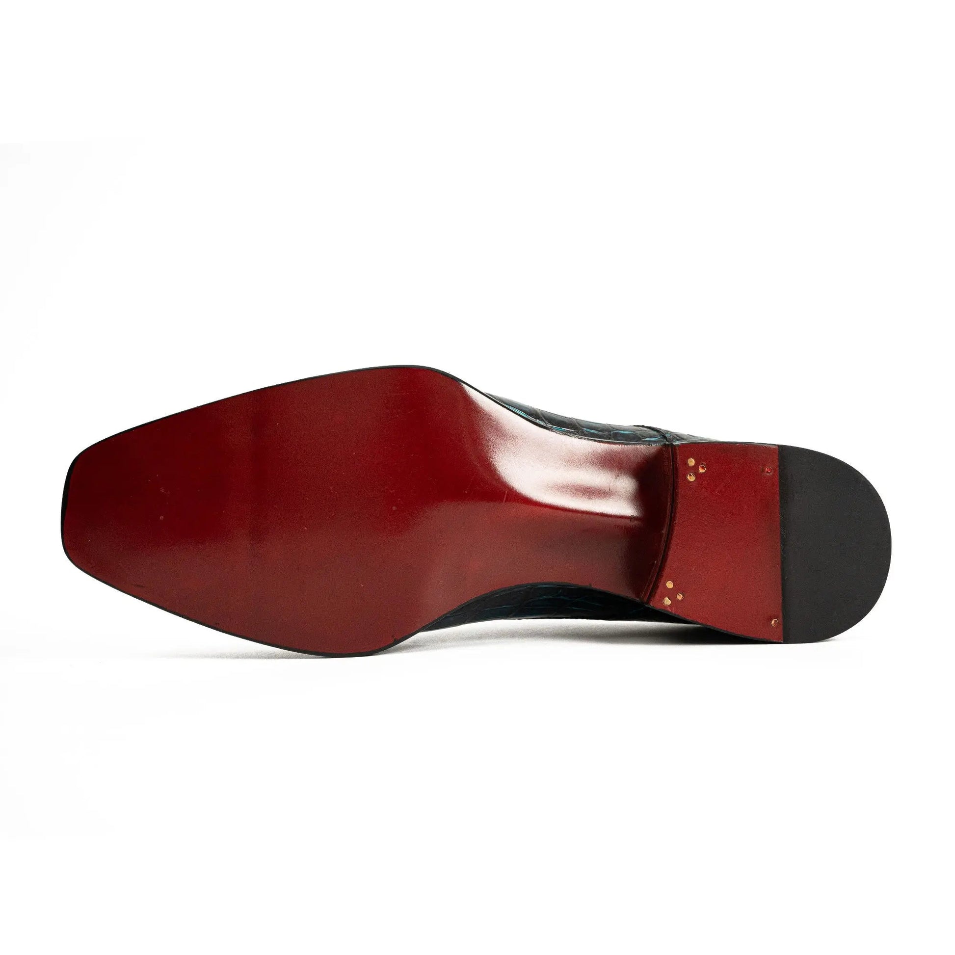 Crafted for the discerning gentleman, this Norwegian-Stitched Derby Shoe redefines luxury with its Zimbabwe Nile crocodile leather upper, hand-selected for its dramatic scale patterns and rare blue-black ombr finish. Each pair showcases the artisanal Norwegian welt construction?atriple-stitched with Gutermann royal-grade thread for unparalleled durability and a bold, textured profile.