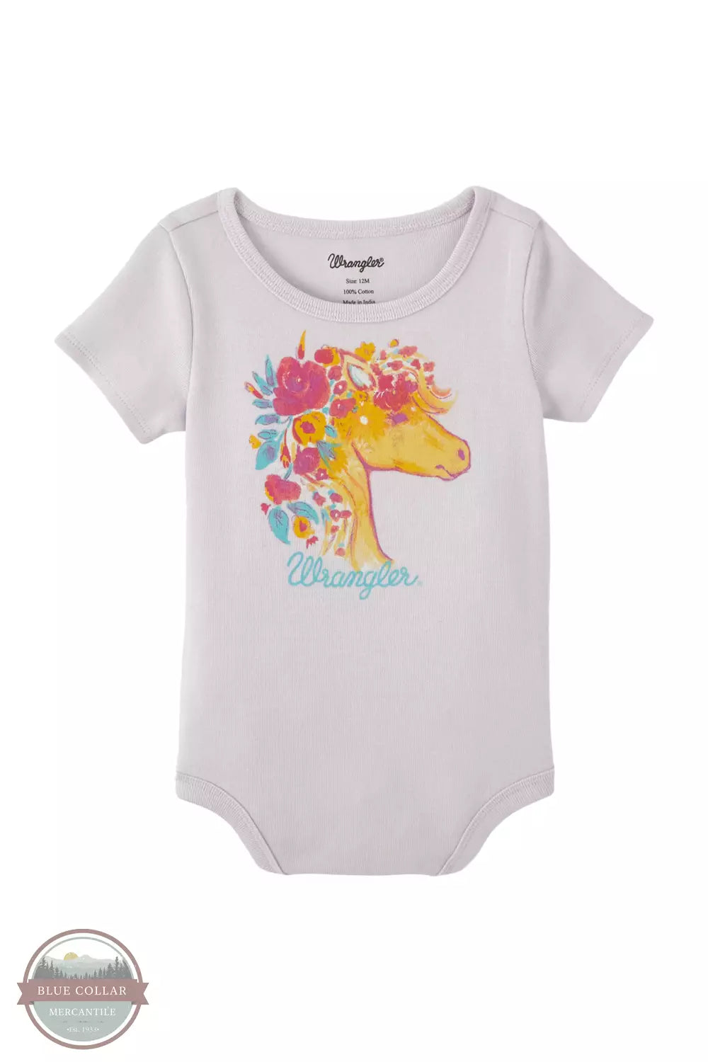 Grey Wrangler infant short sleeve onesie t-shirt with a golden horse head and pink flowers on the front. 100% cotton