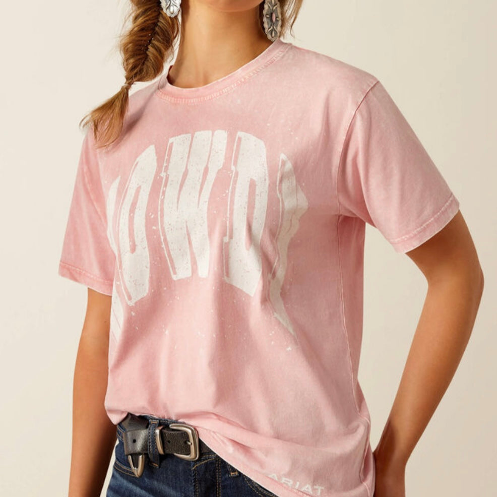 Women's Pink acid-wash short sleeve tee. Crafted from soft 100% cotton with a loose, relaxed fit. White screen print with the word "Howdy". Straight, loose fit with extra length in the sleeves and body