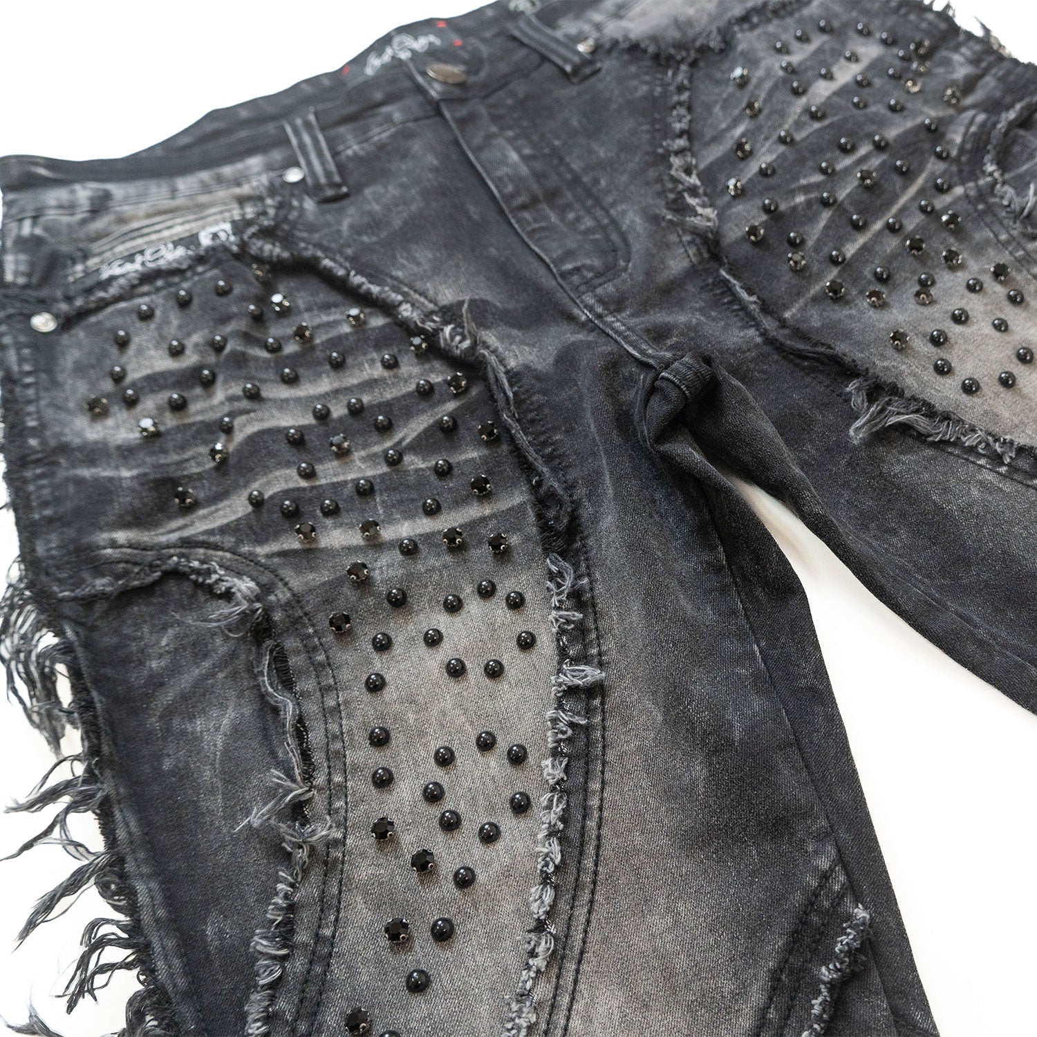 Make a bold statement with these Makobi Stack Jeans — where premium denim meets intricate craftsmanship. Designed with a stacked leg silhouette for that elevated streetwear edge, these jeans feature heavy distressing, raw frayed hems, and curved stitched paneling that sculpts the leg. Each pair is detailed with metallic stud embellishments for a luxe, rebellious finish.