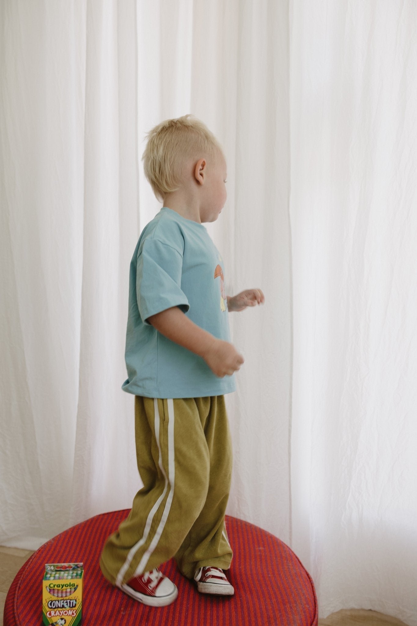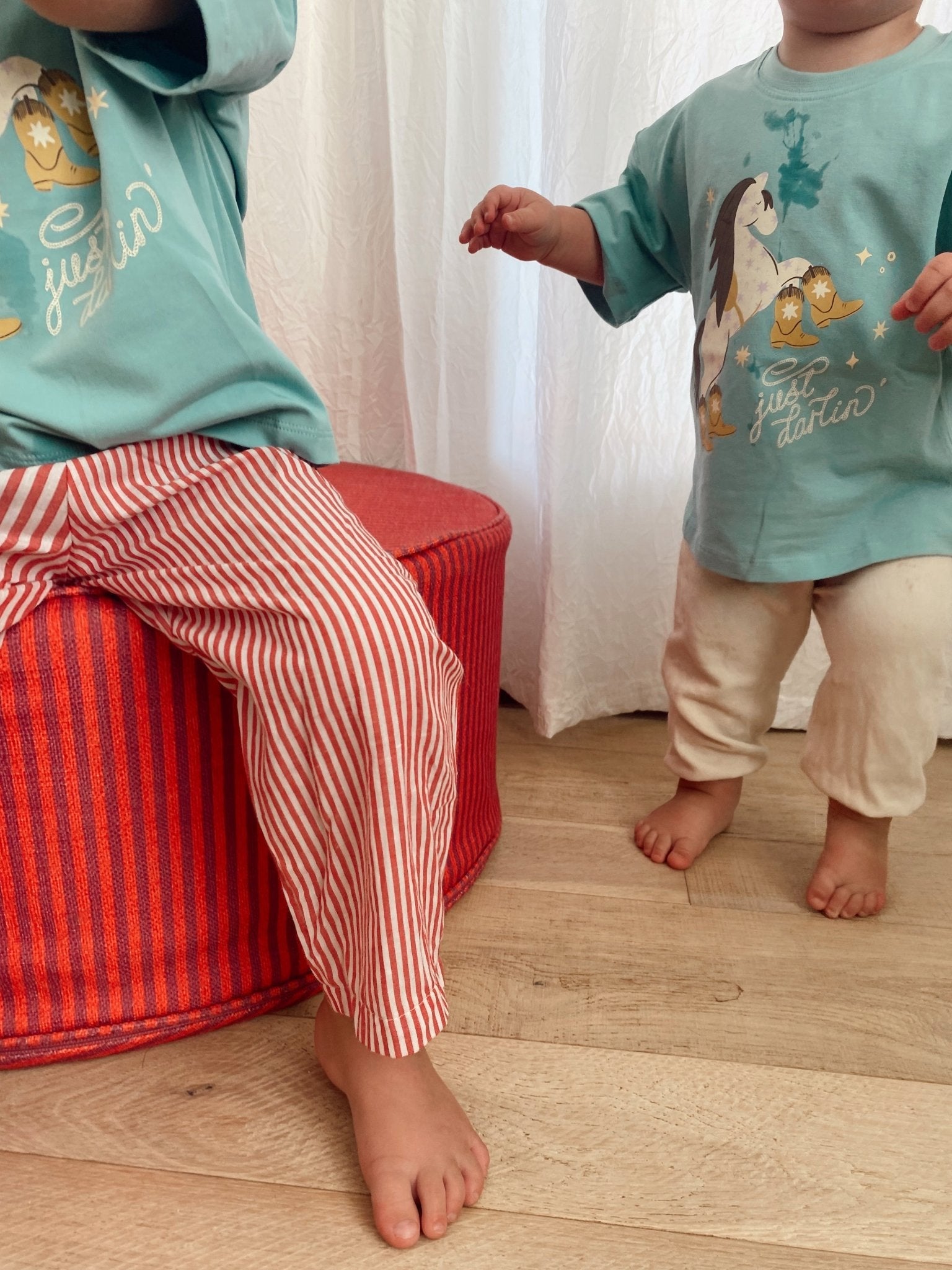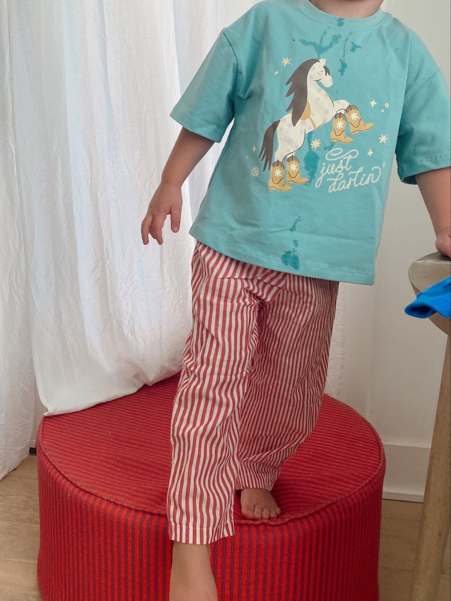 Model wearing loopy boxy tee and Horse Boxy Tee in size 3T, he is 3 and 42" tall and 40lbs. He could wear a 3T or 4T, wears a 3-5Y in our banana chill tee.