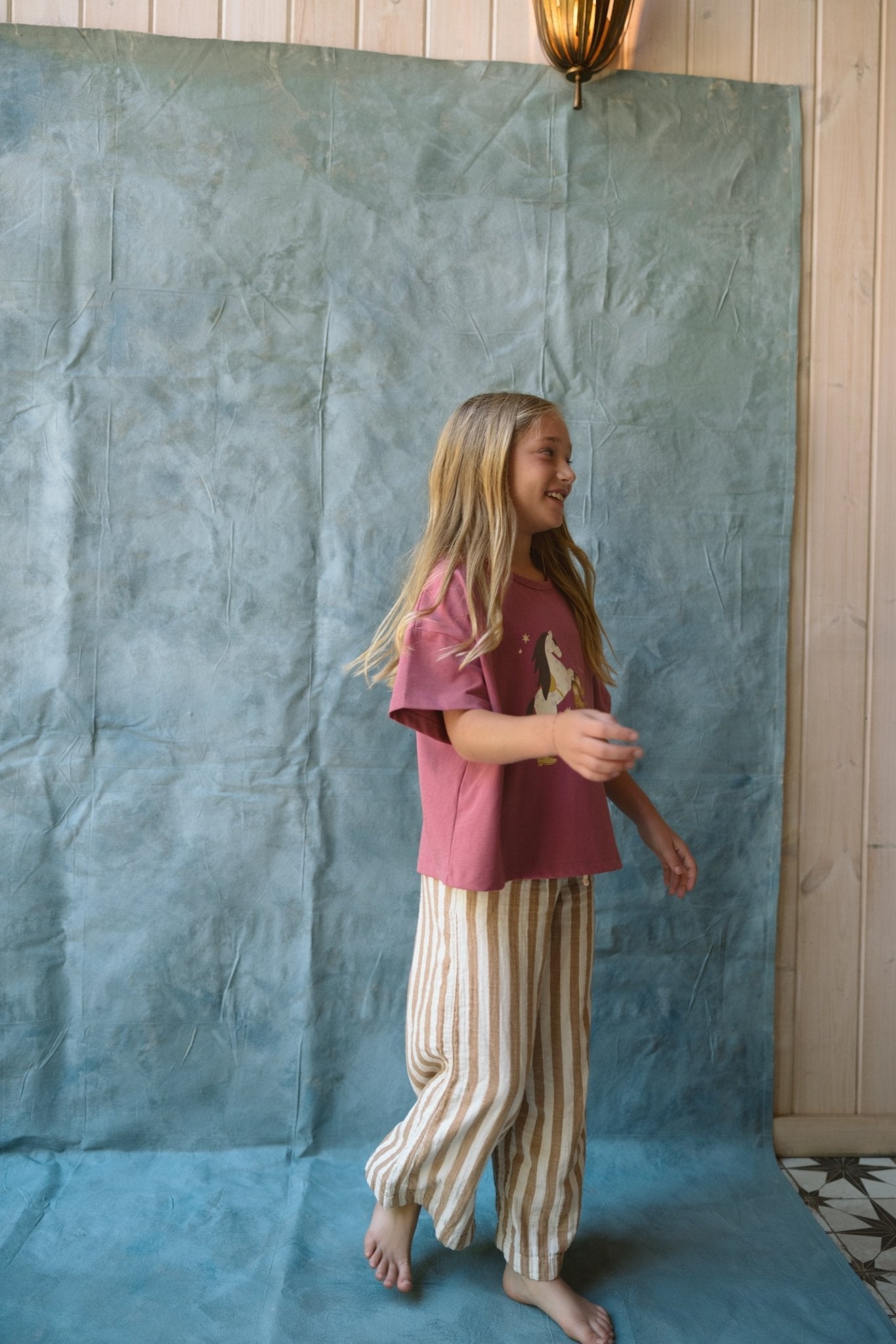 Blair (blonde + blue stripe pants) is 5 & 44" tall wearing size 5-7Y