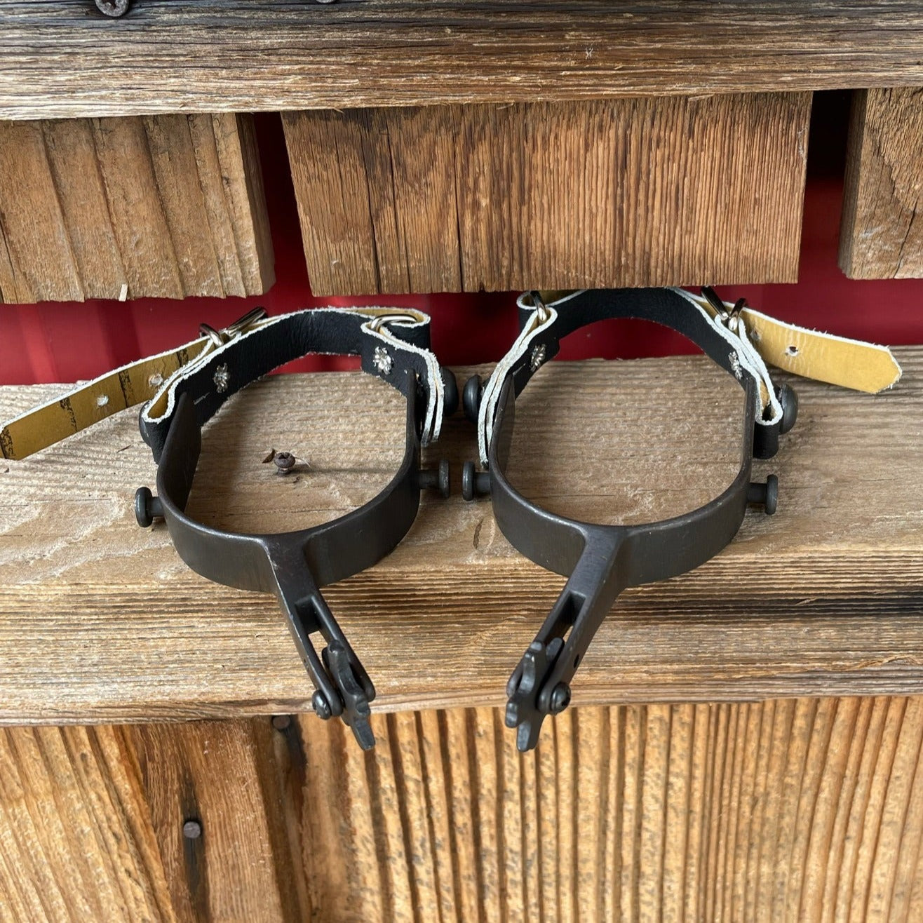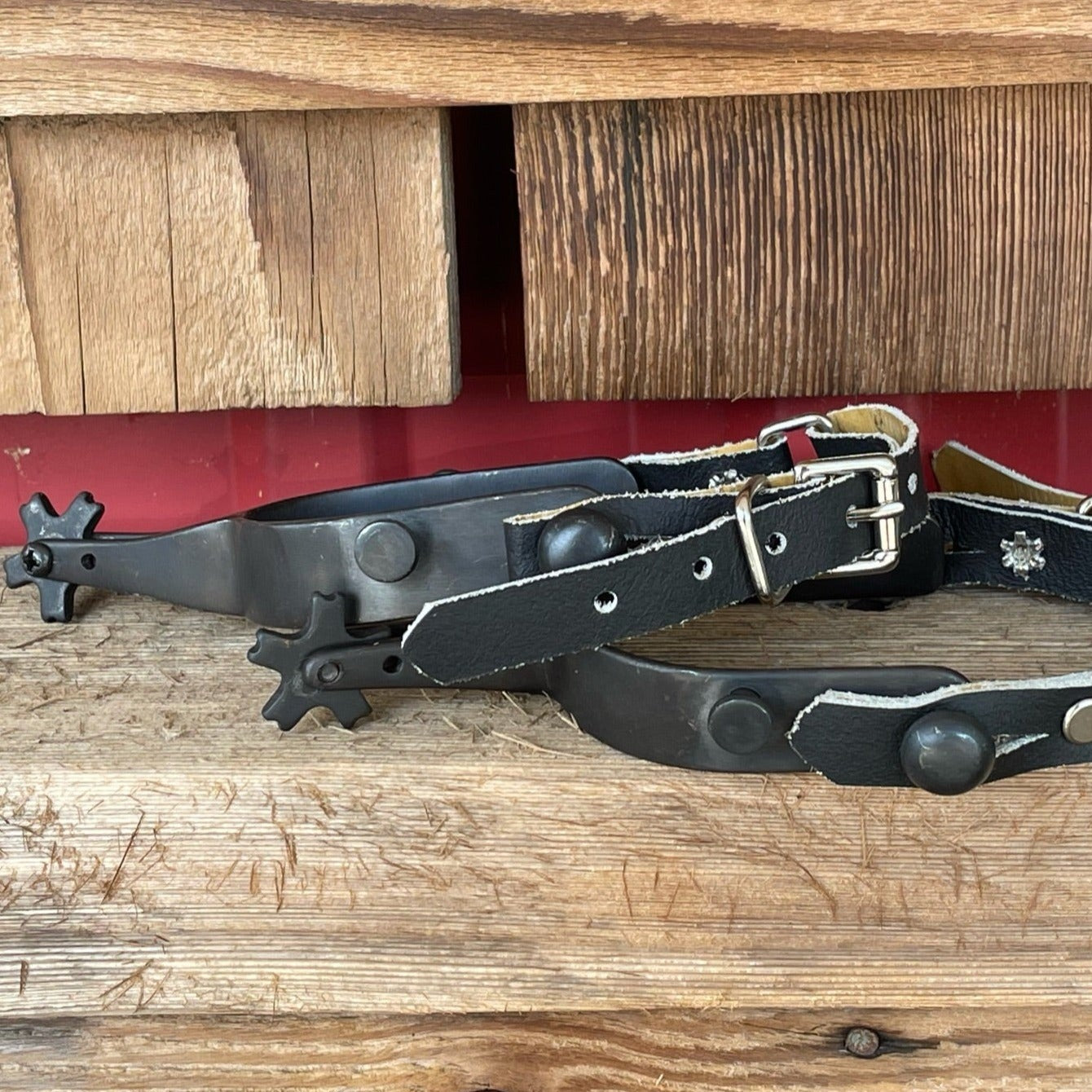 This kids mutton spur with black leather strap is a great addition for your little ones sheep riding.