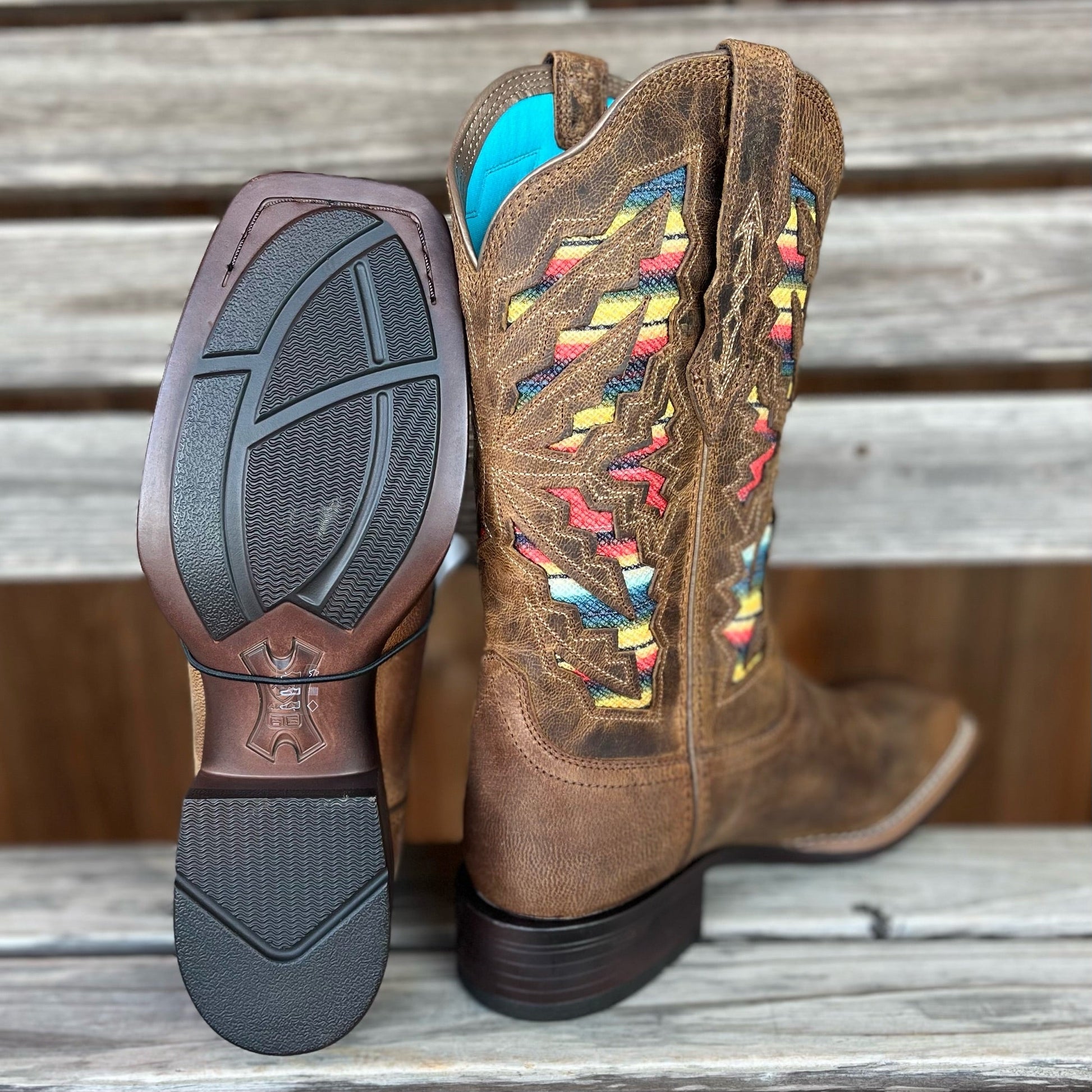 Women's Laney VentTEK Ariat boot. Square toe. Desert Pearl brown with multicolor serape cutout vents on top. Style# 10044444