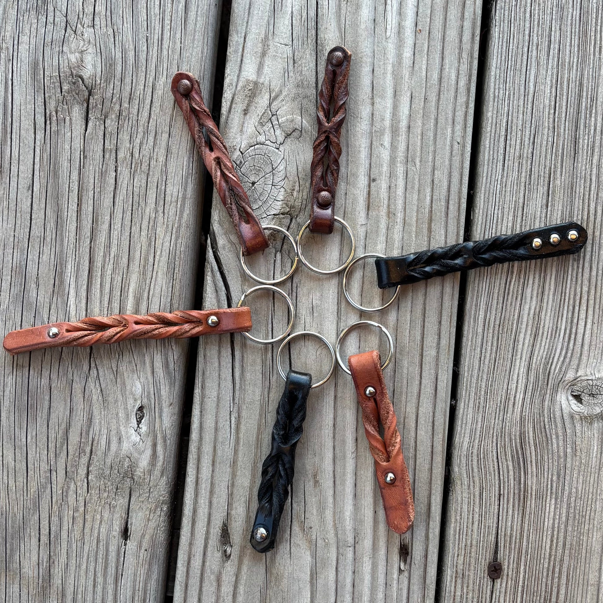 Custom leather keychains with a twisted design and studs
