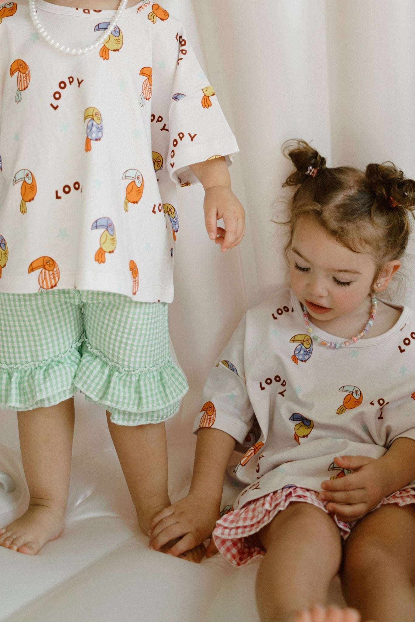 Model Sizing: Pink shorts (Remi) is wearing size 3-5 and is 2 years old and 28lbs, Green Shorts (Stevie) is wearing a size 2-3 and is 2 years old and 30lbs.