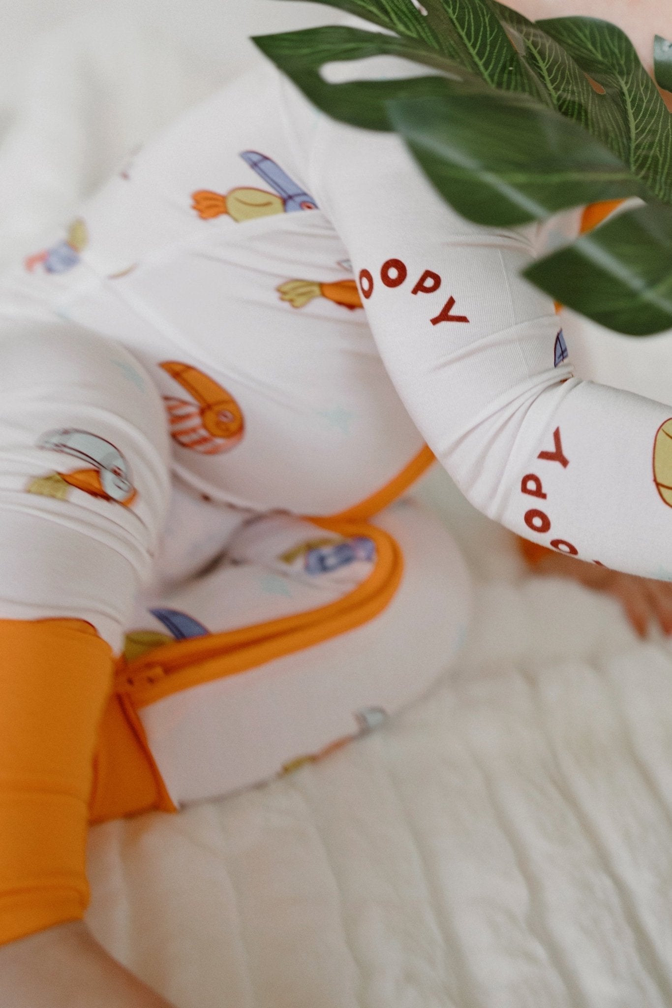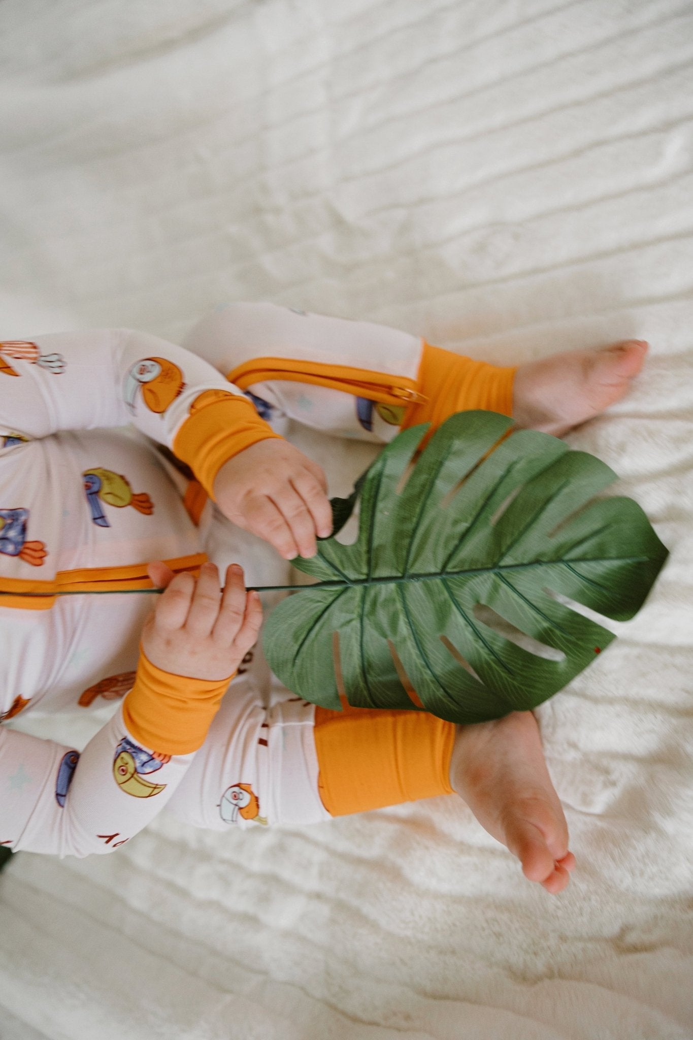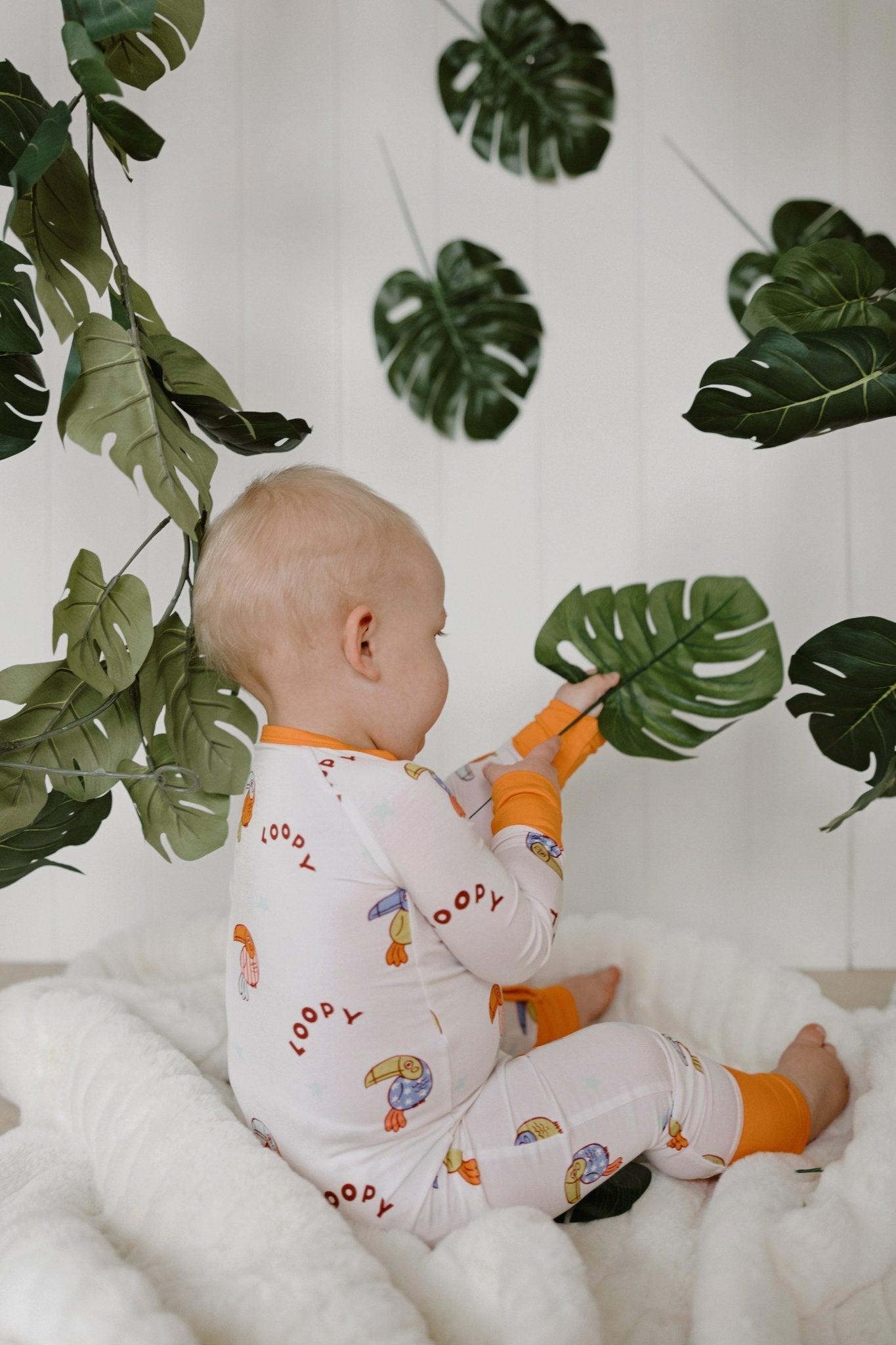 Our Loopy Bamboo Zipper Pajama Romper for Babies & Toddlers is full of playful vibes and everyday comfort. Featuring our colorful toucan-inspired print, this footless zip-up romper is made from a premium blend of 95% viscose from bamboo and 5% spandex, breathable, buttery-soft, and gentle on sensitive skin.