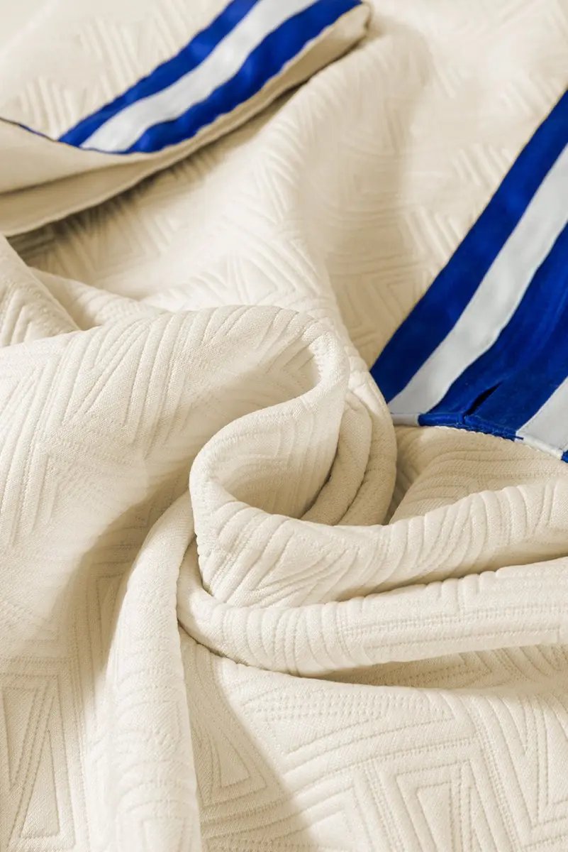 - Color: beige base with blue striped trim