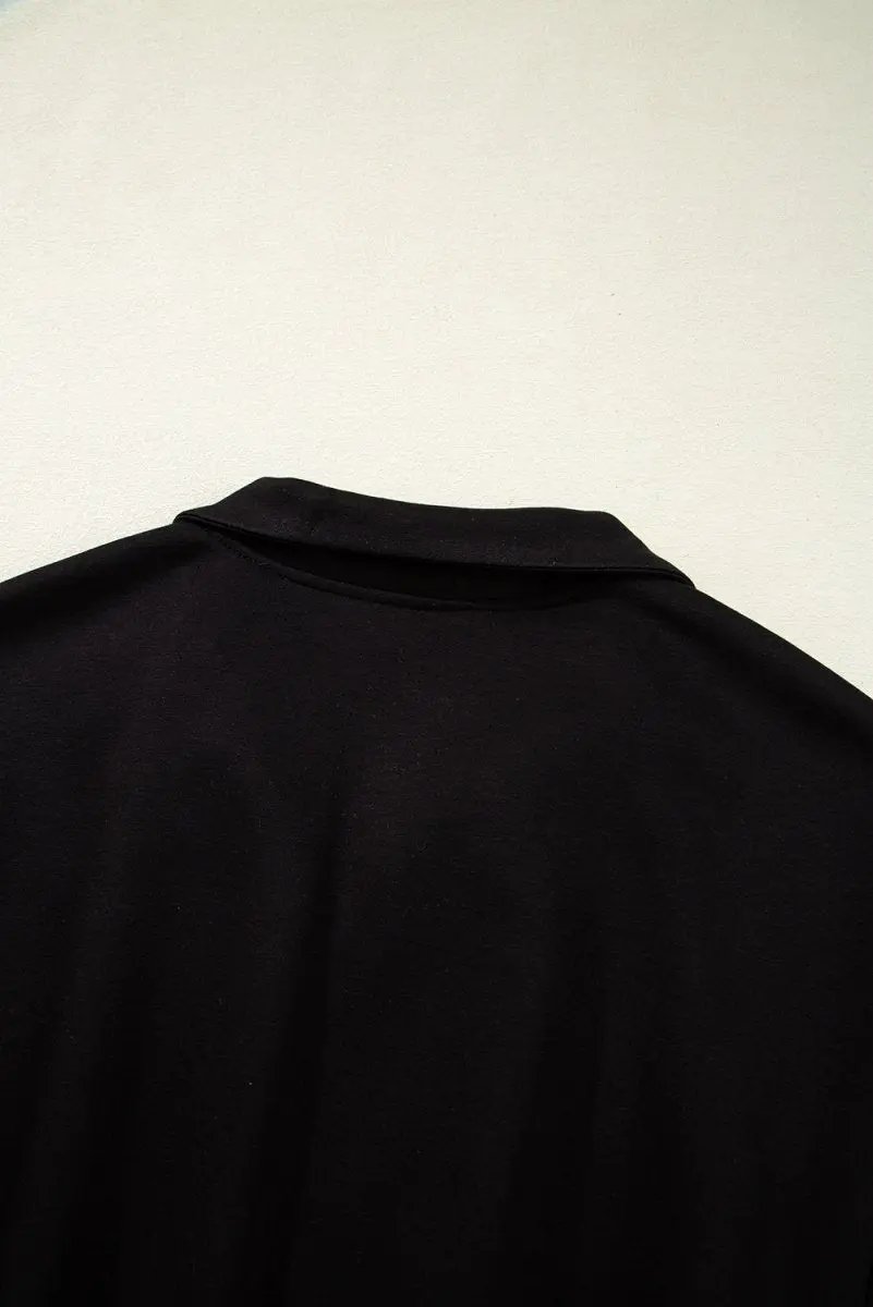 Introducing the Black Contrast Collar Patchwork Zip Front Romper, a versatile piece designed for effortless style and comfort. The colorblock patchwork creates a striking visual impact, while a chic collared neckline adds a refined touch. A front zipper offers easy dressing, and wide short sleeves keep you cool in warm weather. An elastic high waist shapes the silhouette for a flattering fit that moves with you.