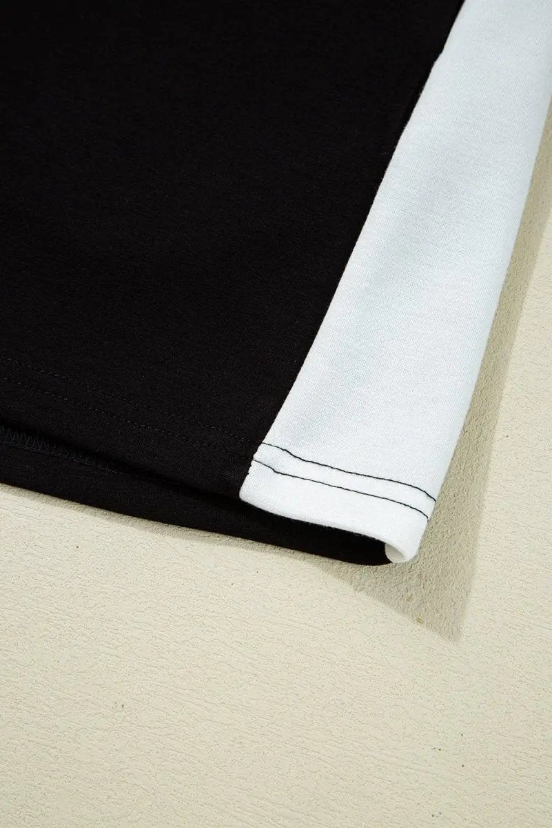 - Color: black with white contrast panels in a colorblock patchwork design