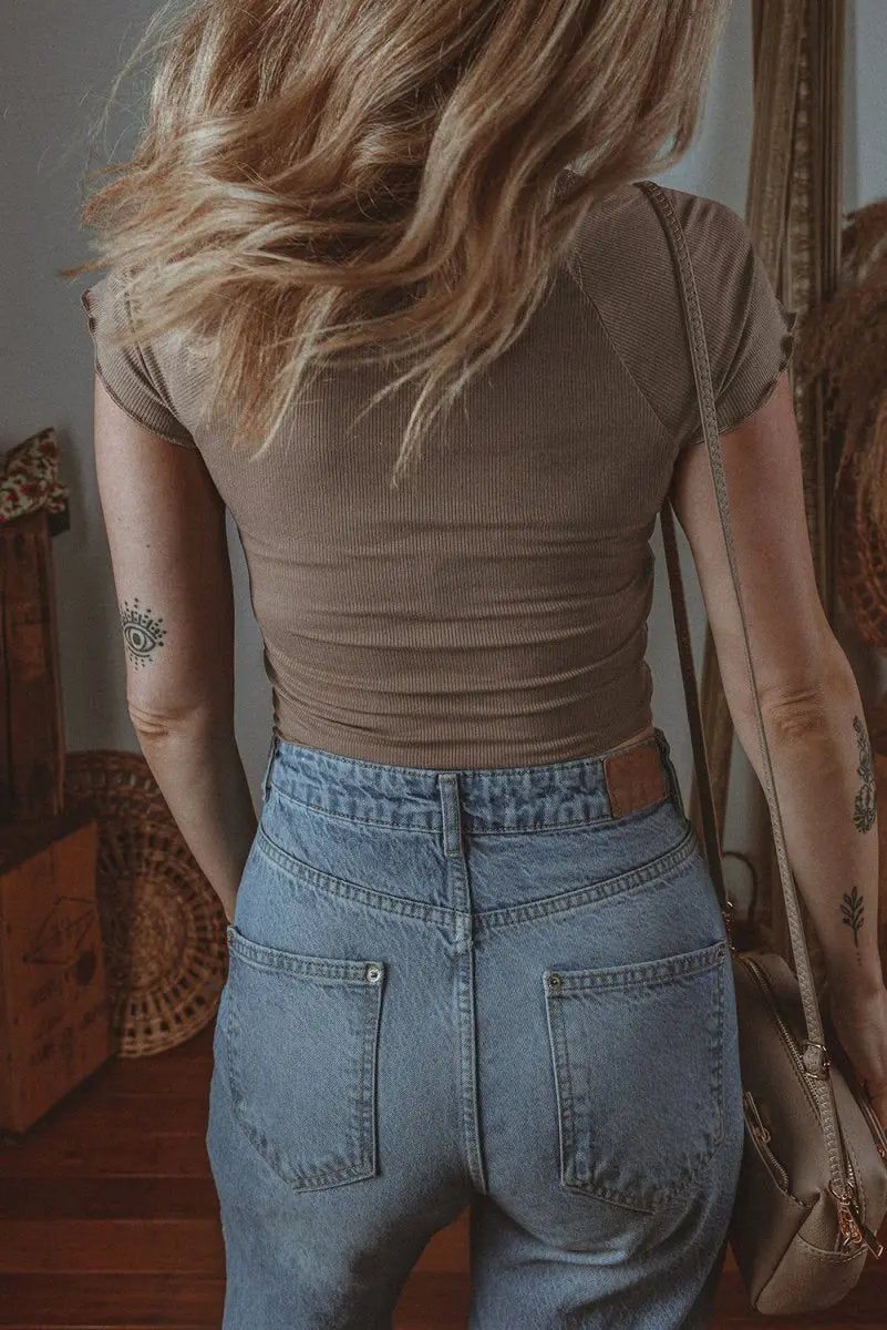 Love Salve Dark Brown Ribbed Tee Women's Daily Wear V-Neck Slim Fit T-Shirt