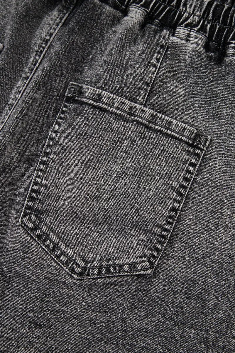 These high-rise denim shorts offer a balanced blend of comfort and style for summer outings. The elasticized drawstring waistband provides a customizable fit, while the high waist creates a flattering silhouette suitable for pairing with cropped or tucked-in tops. Constructed from a durable fabric blend—59.8% cotton, 27.9% polyester, 10.6% viscose, and 1.7% elastane—the shorts resist wear with a soft, flexible feel and a slight stretch for ease of movement. The gray denim finish features a solid pattern and a shift silhouette that pairs effortlessly with any top. Functional pockets add practical storage for daily essentials, from keys to cards. The design includes rolled hems for a relaxed, casual look, and a size range from S to XL ensures a comfortable fit for various body types.