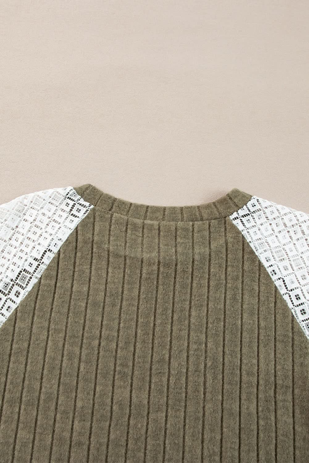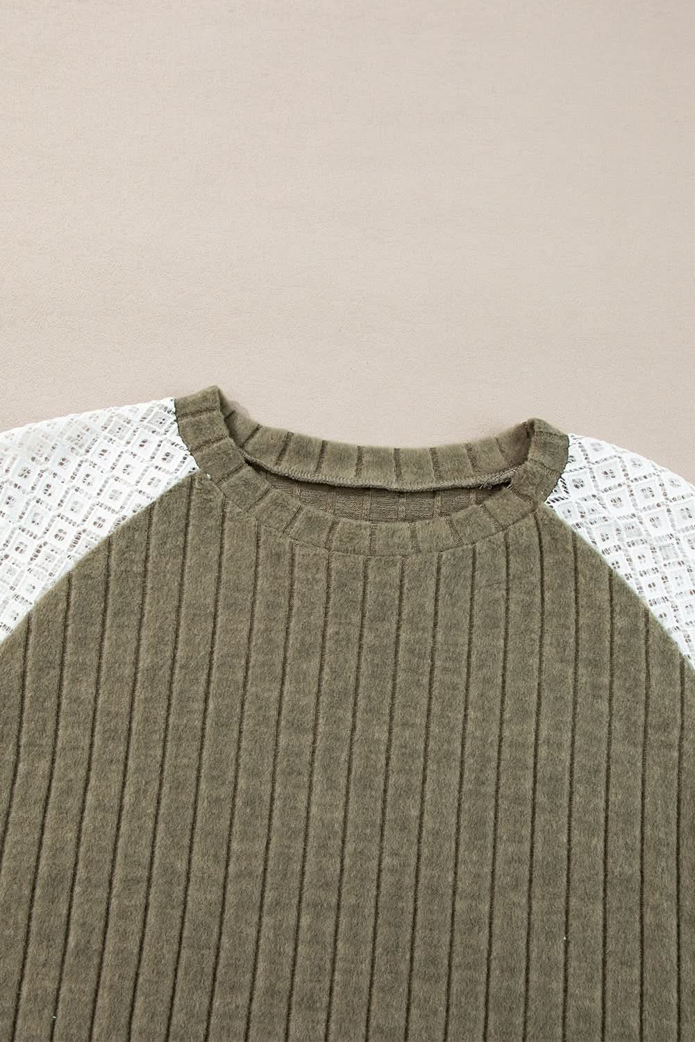 - Style: Textured knit, floral patchwork sleeves, raglan design