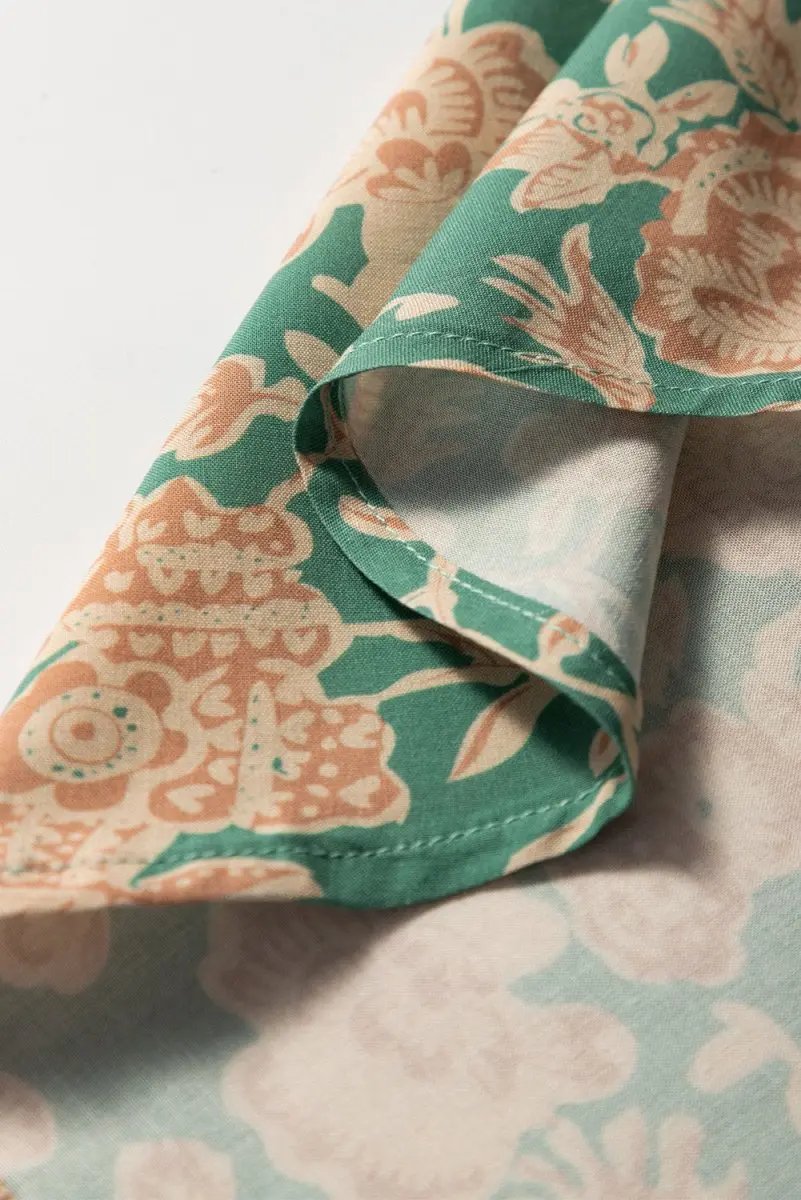 Green Floral Print Pleated Buttoned V-Neck Short Sleeve Blouse