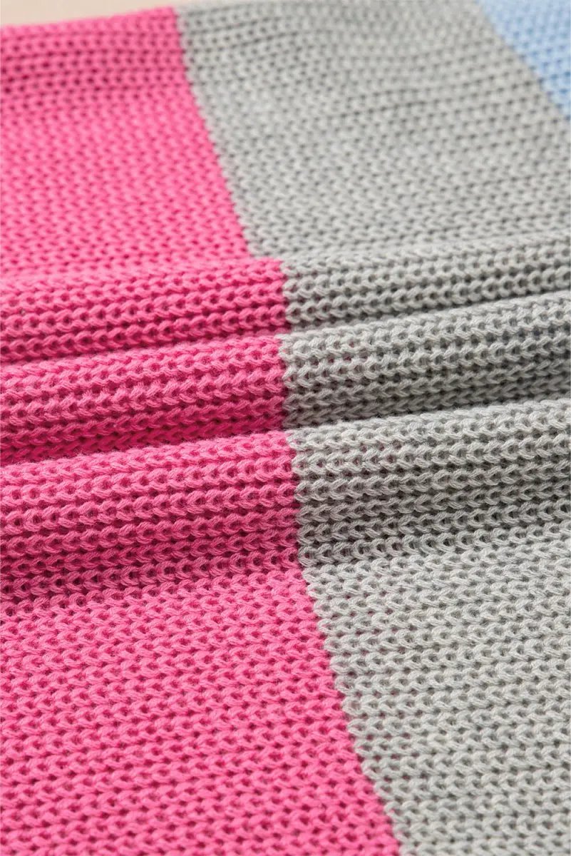 - Neckline: notched V-neck; color-block knit design
