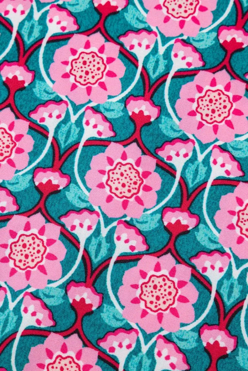 The Sachet Pink V-Neck Ruffle Abstract Floral Print Puff Sleeve Top combines lightweight comfort with feminine detailing for summer wear. Crafted from 100% polyester, it offers an airy feel and easy care. The V-neck neckline flatters the neckline while the puff sleeves and ruffle accents add a subtle statement. The abstract floral print blends pink, green, and turquoise tones for a vibrant, versatile look that pairs with jeans or skirts for a range of occasions. The silhouette is a relaxed shift fit that drapes over the body and suits all body types. Short sleeves provide breezy comfort in warm weather. Easy to style with casual daytime outfits or dressier brunch looks. This top is designed to be worn with your favorite bottoms and is compatible with a variety of casual and semi-formal ensembles.