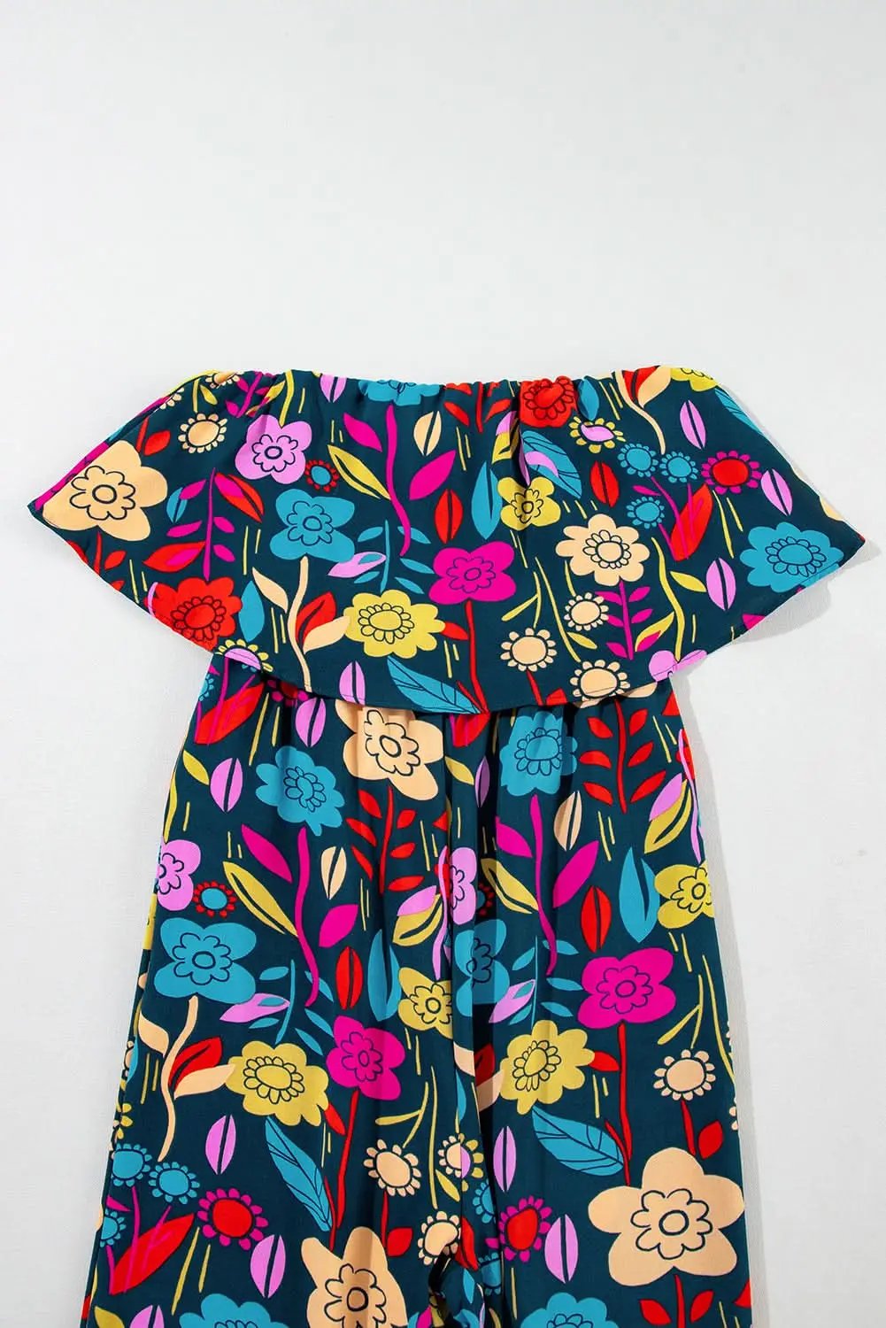 Elevate your warm-weather wardrobe with a strapless silhouette that showcases the shoulders in a clean, elegant line. The design features a flouncy ruffle bib for a playful yet refined touch and asymmetric ruffle pant legs that create movement and visual interest.