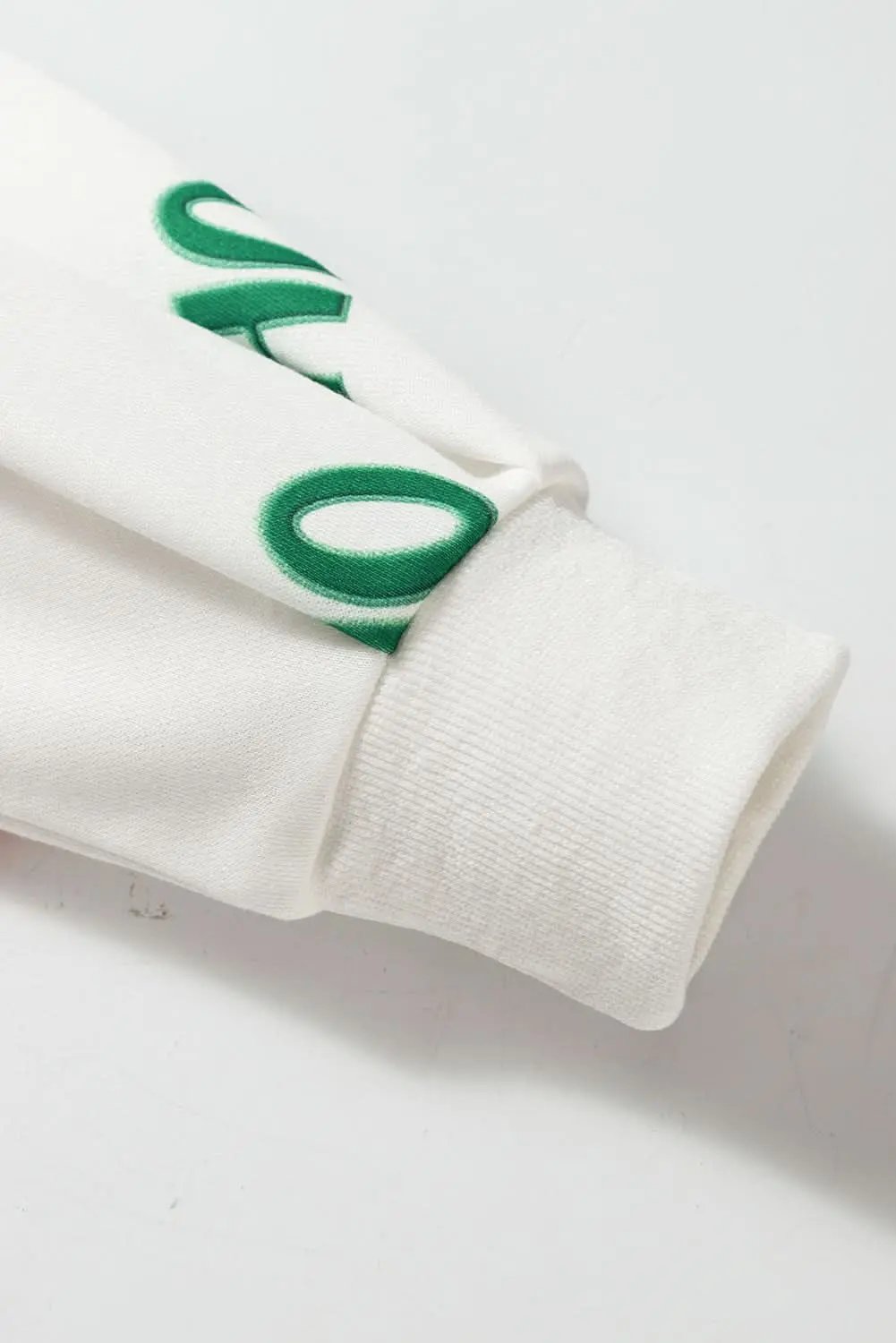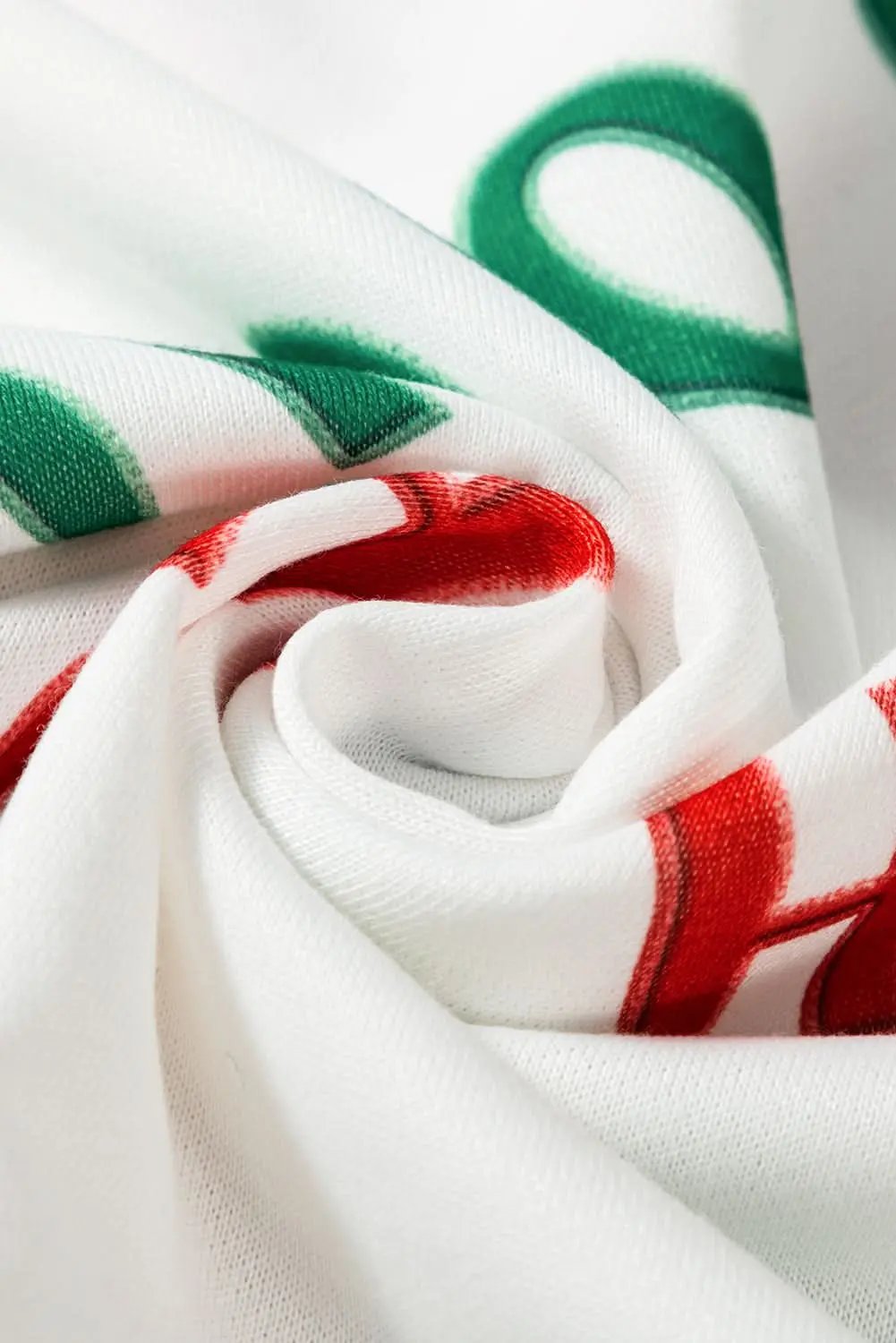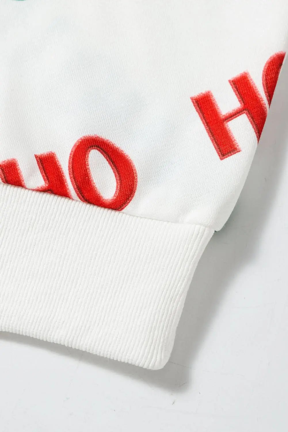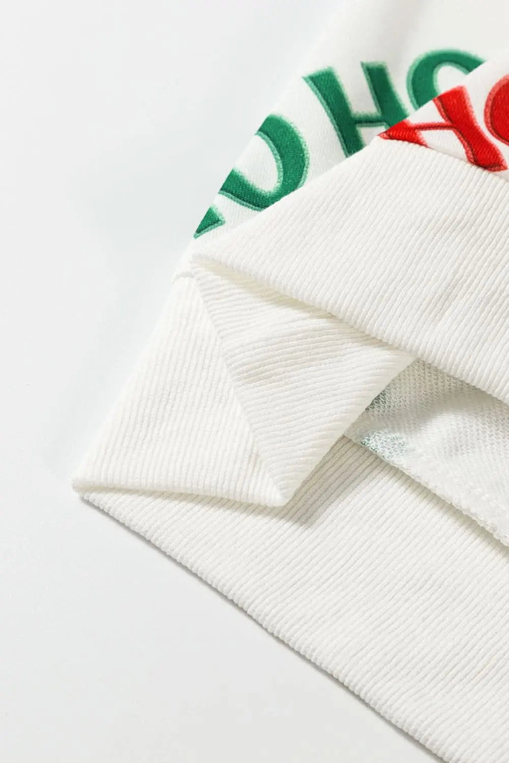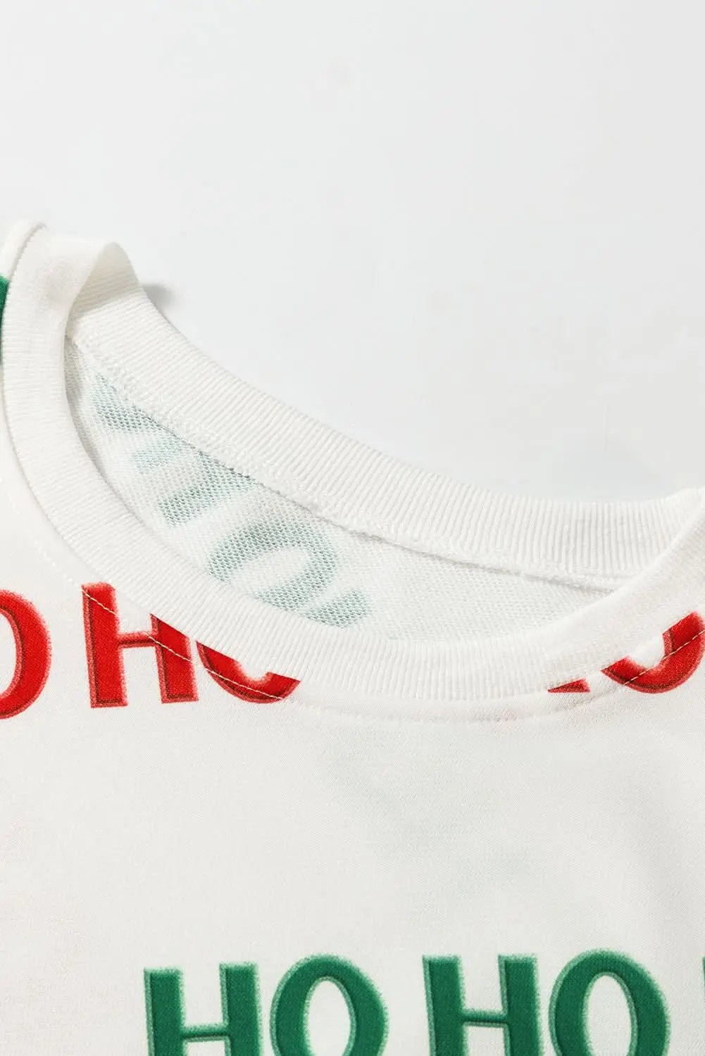 Celebrate the holidays with a comfortable, coordinated two-piece set designed for lounging and casual wear. The pullover features a relaxed, drop-shoulder silhouette and a festive HOHOHO print in red and green on a white background, creating a cheerful, holiday-ready look.