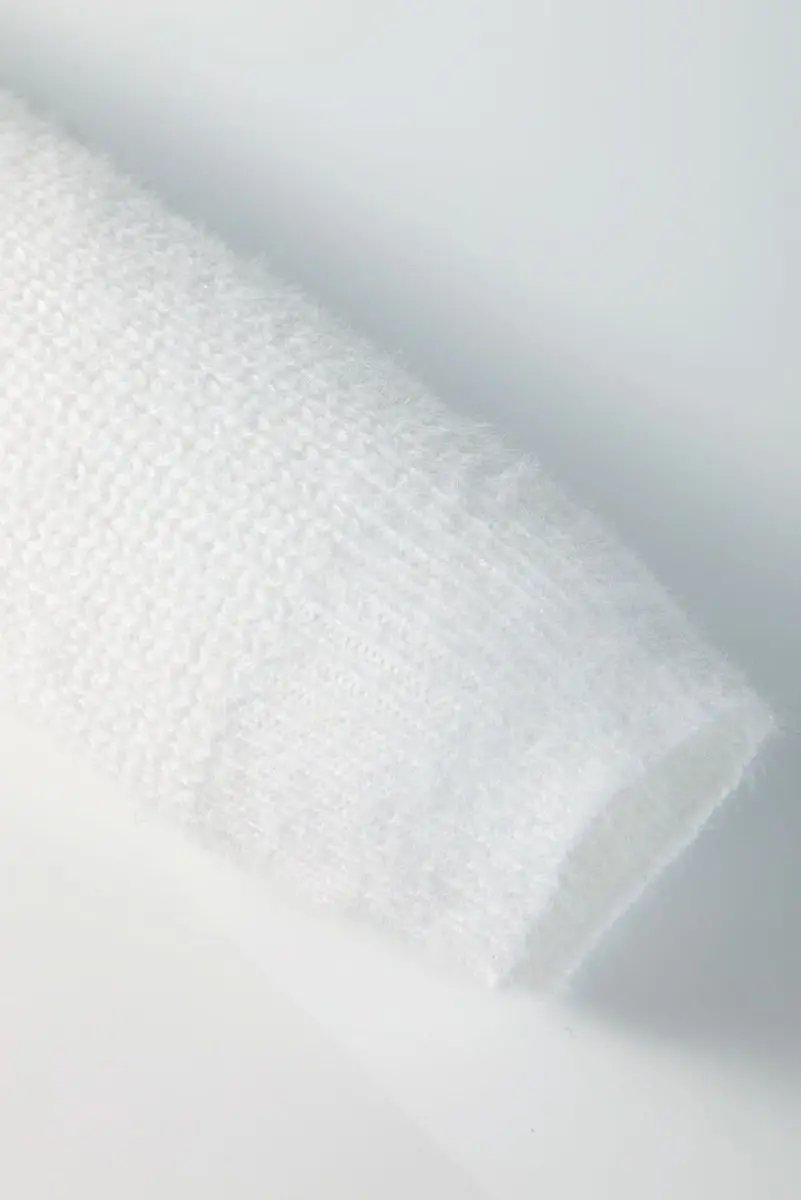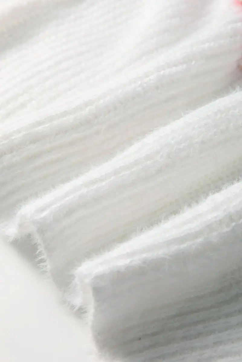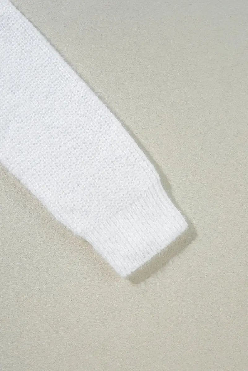 White Pearl Beaded Heart Pattern Fuzzy V-Neck Sweater