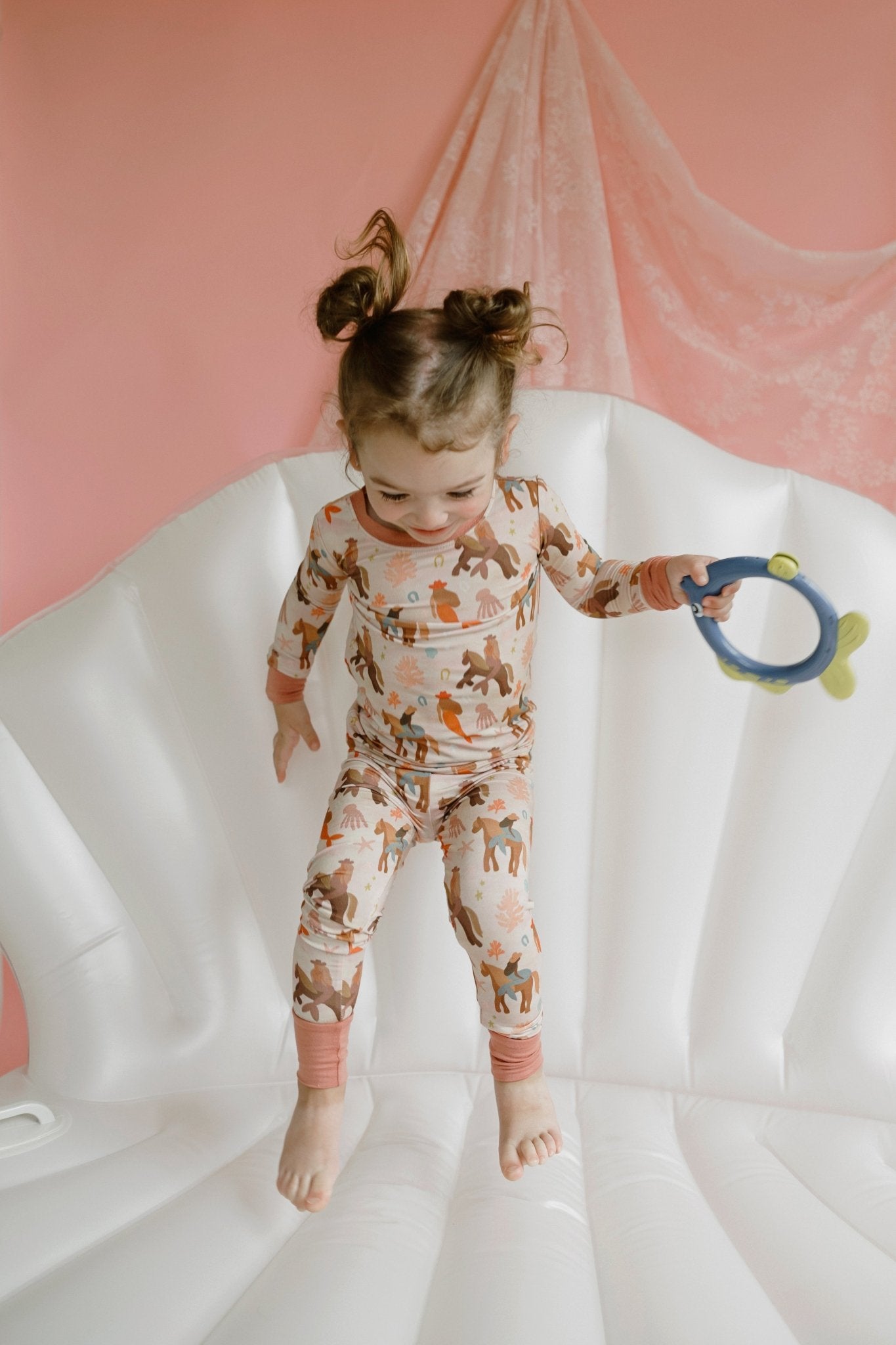 Our Mermaid Cowgirl Two-Piece Pajama Set – Toddler & Kids Set is made for cozy times, slow mornings, and everything in between. Featuring our whimsical mermaid-meets-western print, this long-sleeve top and matching pants set is made from a premium blend of 95% viscose from bamboo and 5% spandex — buttery-soft, breathable, and stretchy for all day comfort.