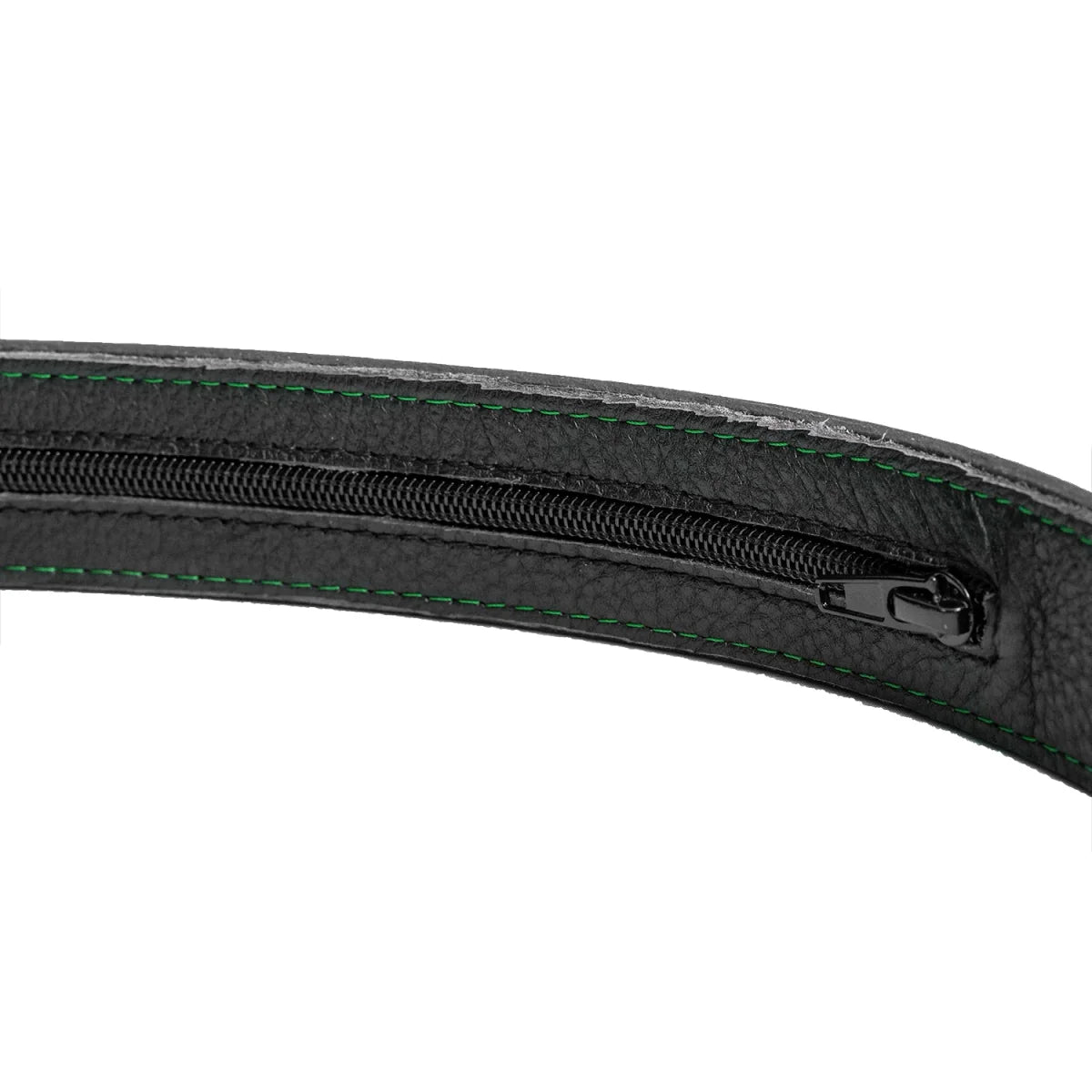 This belt has a unique hidden feature - a hidden zipper on the interior for storage! It's crafted from pressed and buffed cowhide.