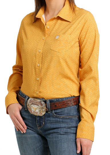 Women's Cinch Arenaflex long sleeve button up mustard colored with designs