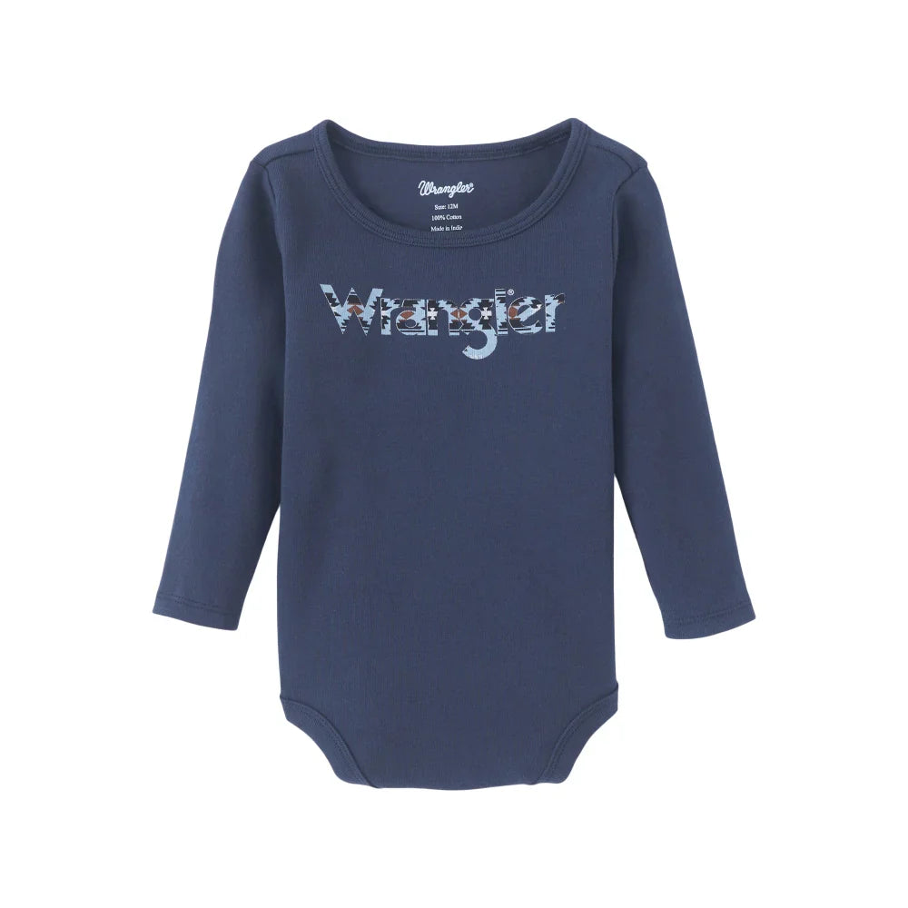 Navy blue long sleeve infant onesie with a Wrangler logo on the front in aztec print. 100% Cotton