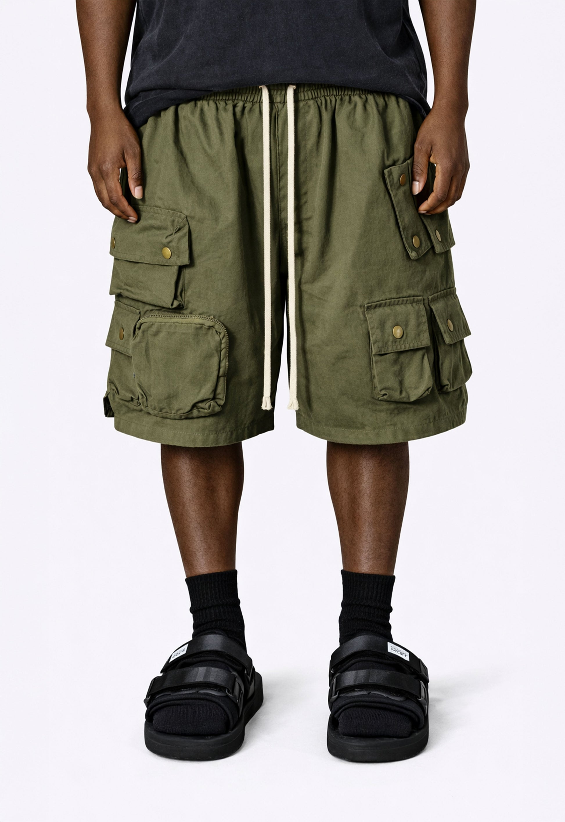 Our Olive Multi Cargo Shorts are designed with a relaxed fit, featuring lightweight cotton with six tactical pockets, and an elongated drawstring,
