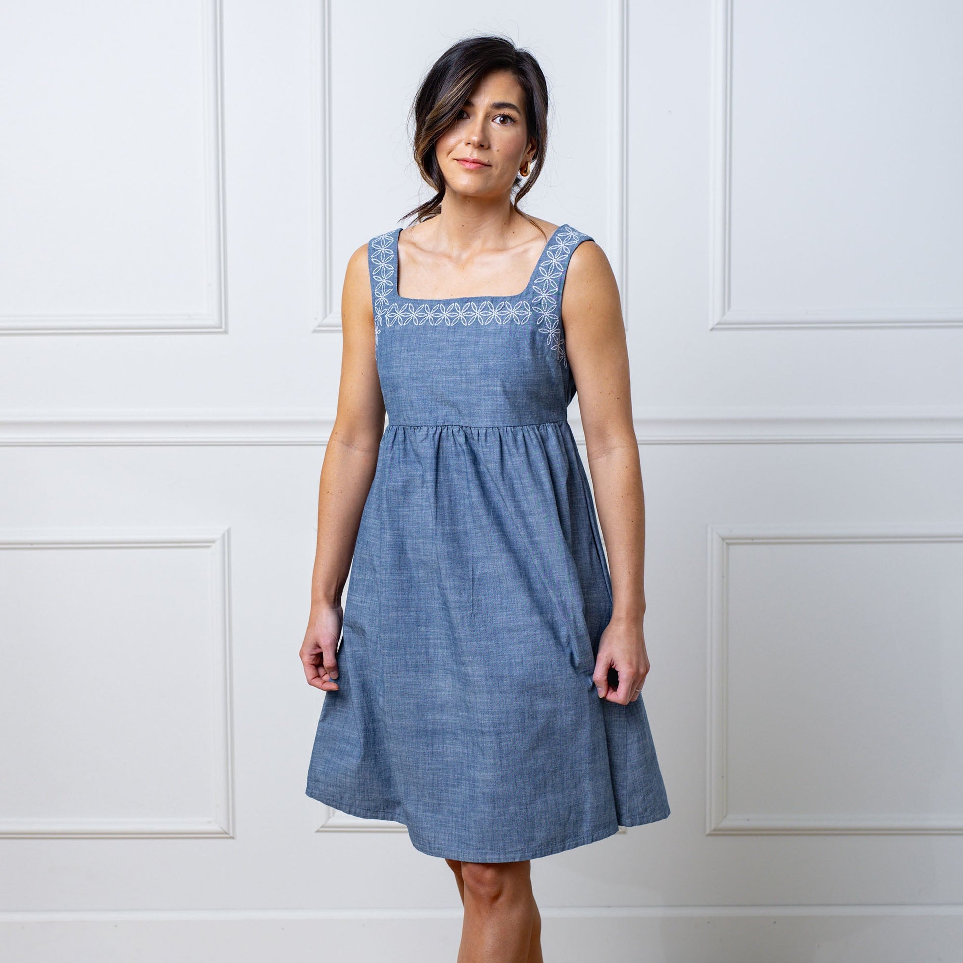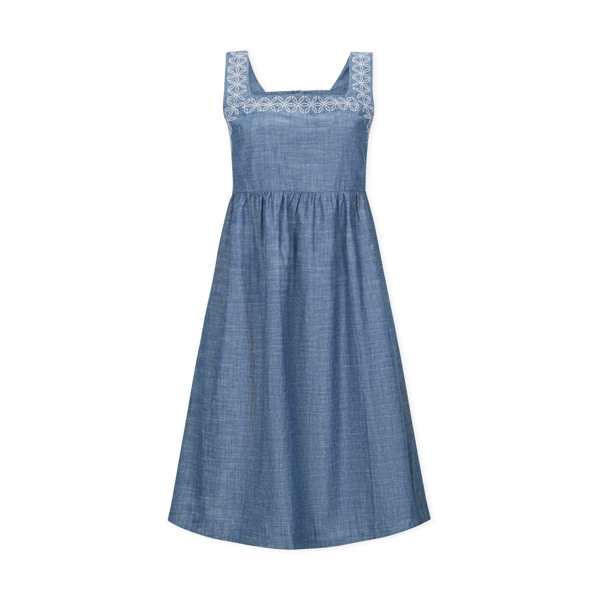 With a simple but flattering silhouette, our summer dress can take you from a picnic to a party with ease. Cut from our soft organic cotton chambray, this lightweight dress features a beautiful embroidered detail at the neckline and straps, and a zipper closure down the center back. Bodice lined in organic cotton.