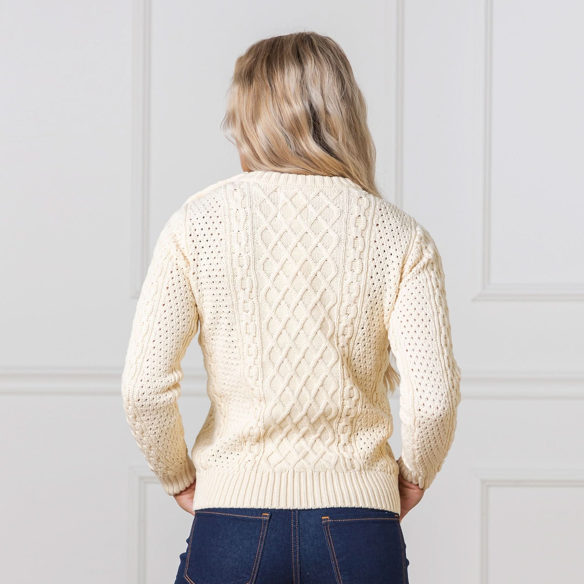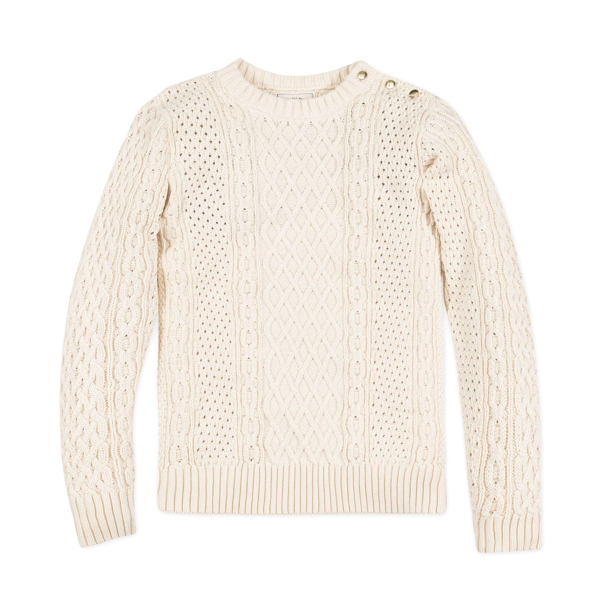 We love a classic fisherman sweater, and our take on it for women is the perfect mix of comfortable yet polished. Features a beautiful allover cable knit in soft organic cotton, a relaxed fit, rib knit trim, and gold buttons at the shoulder for just the right amount of shine. A piece you'll treasure for years to come.