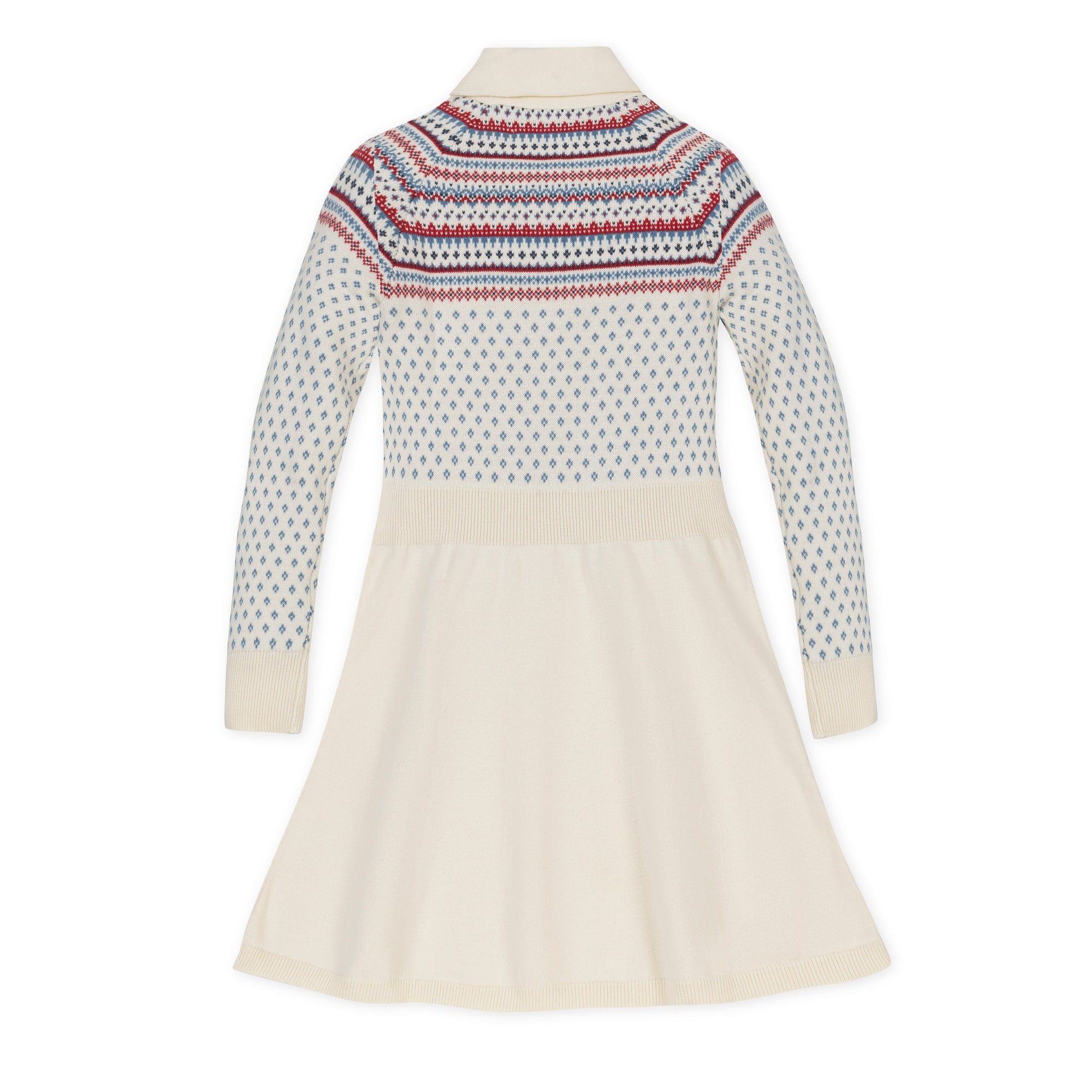 A beautiful fair isle pattern adorns this cozy sweater dress crafted from soft organic cotton. Features a classic shawl collar with a faux horn button closure, gently ballooned sleeves, and a twirly skirt. A mix of birdseye and fair isle gives a sophisticated nod to winter ski style.