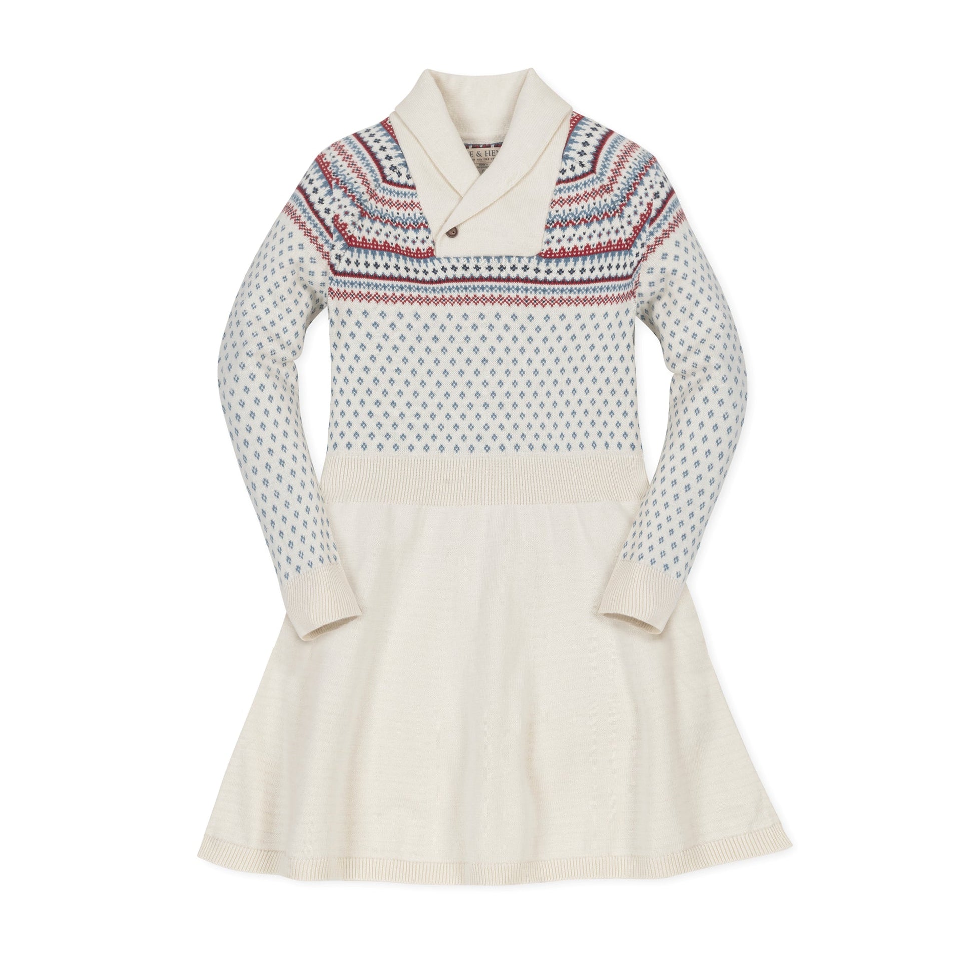 A beautiful fair isle pattern adorns this cozy sweater dress crafted from soft organic cotton. Features a classic shawl collar with a faux horn button closure, gently ballooned sleeves, and a twirly skirt. A mix of birdseye and fair isle gives a sophisticated nod to winter ski style.
