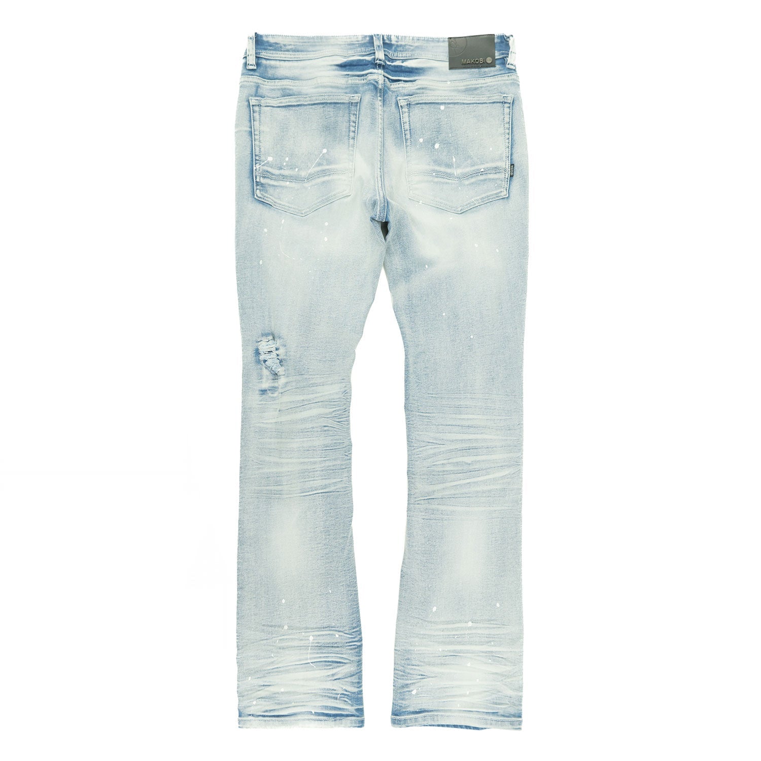 Update to 2026 street style with the MAKOBI M1721 Modena Jeans, crafted for a bold and rugged look. Designed with premium stretch denim, this pair features heavy hand-distressing, ripped details, and layered fabric patches that deliver an authentic worn-in vibe. The light vintage wash is enhanced with paint splatter accents and contrast stitching, giving each pair a unique character. streetwear outfits.