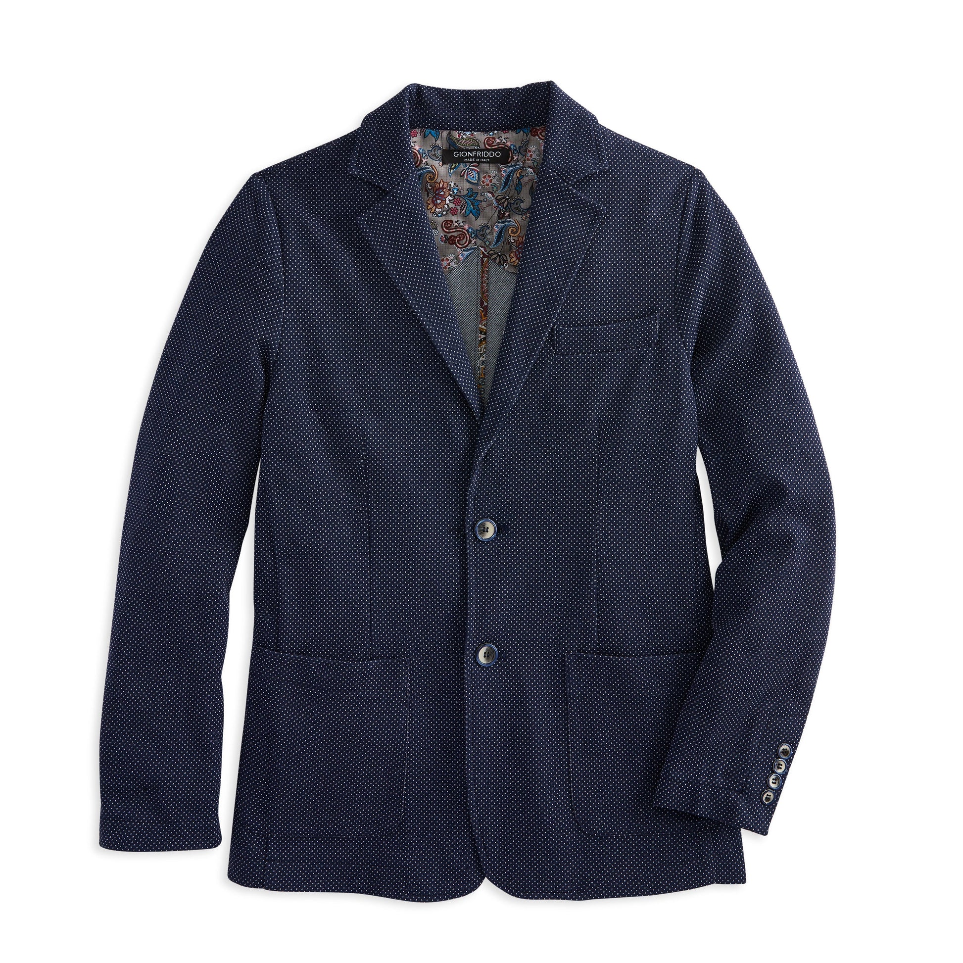 This sophisticated pin dot blazer is crafted to make a classy and stylish statement and tailored for an elegant fit. With two buttons, two sewn-on patch pockets, and a floral paisley lining, it's a perfect choice for any occasion, versatile enough to be paired with a jean or a more formal trouser.
