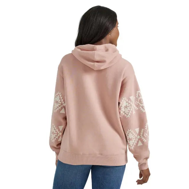 Women's Wrangler pink hoodie with a white aztec design and a dark purple logo on the front. Fabric: 80% Cotton/ 20% Polyester