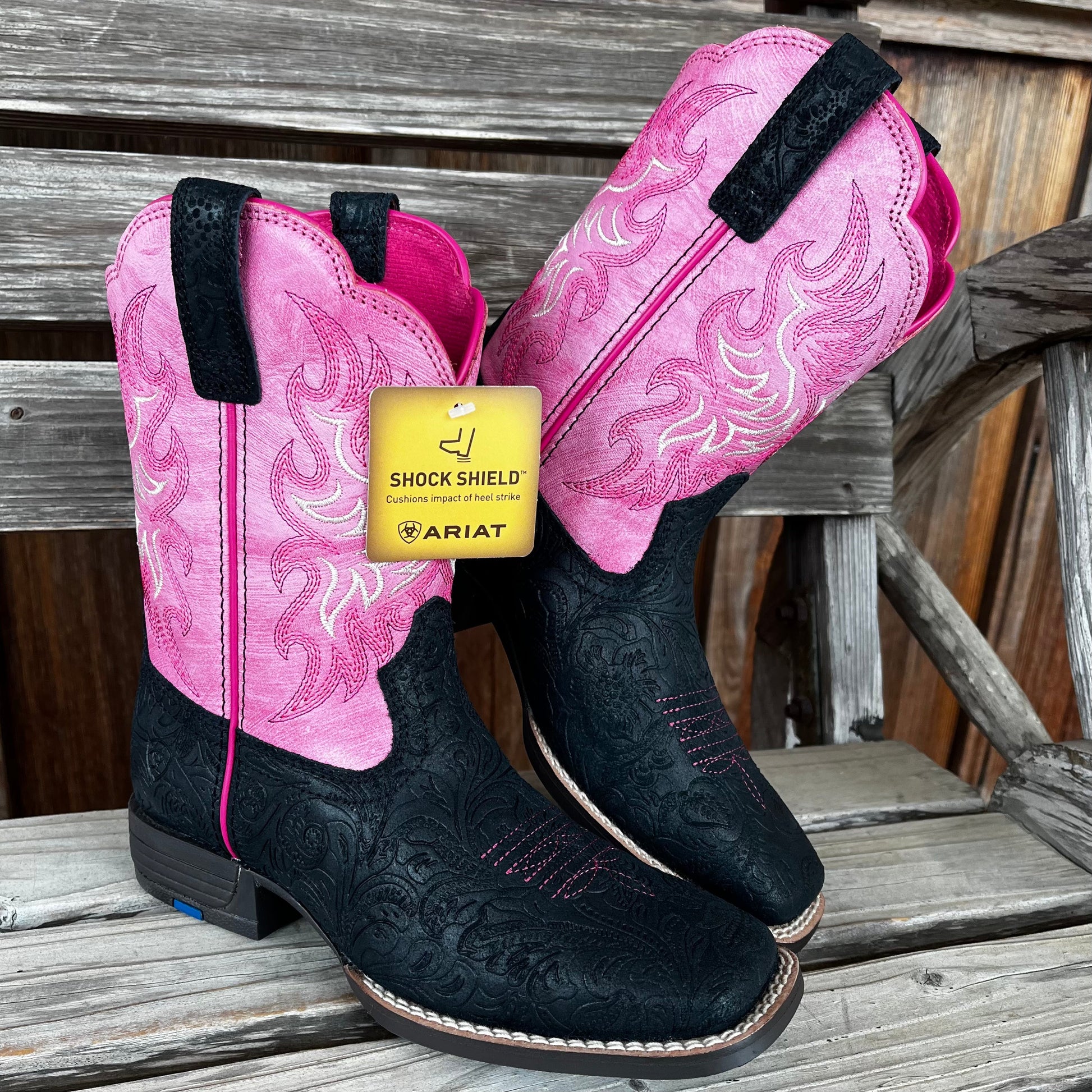 Little girls Ariat boots with pink tops and black floral embossed bottoms, shock shield, rubber soles