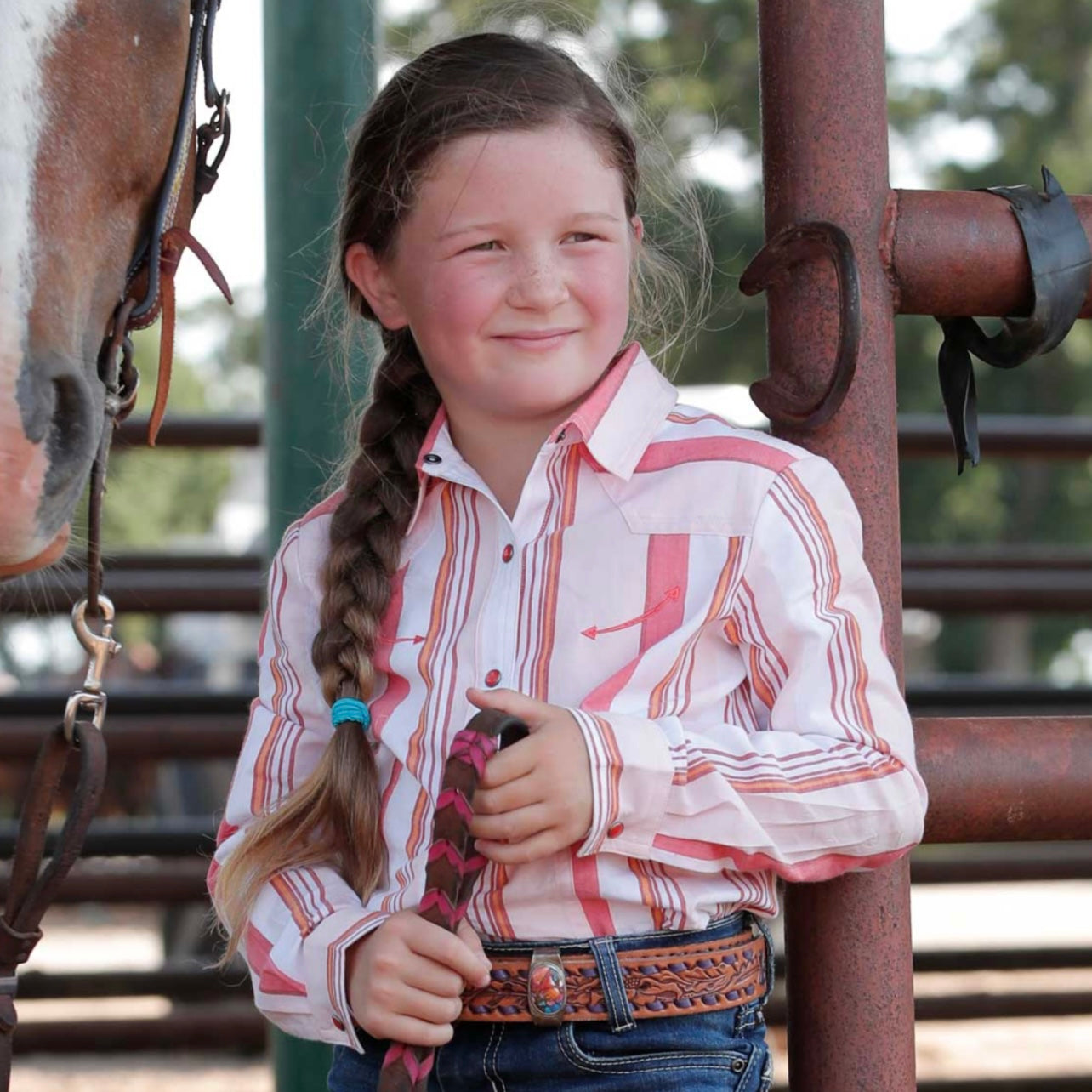 Little Girls long sleeve button up, Pink and Orange vintage vertical stripes, red pearl snaps and faux smile pockets