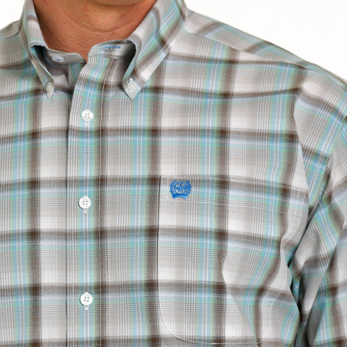 Long sleeve white, green, and blue plaid button down perfect for rodeos or dressing up.
