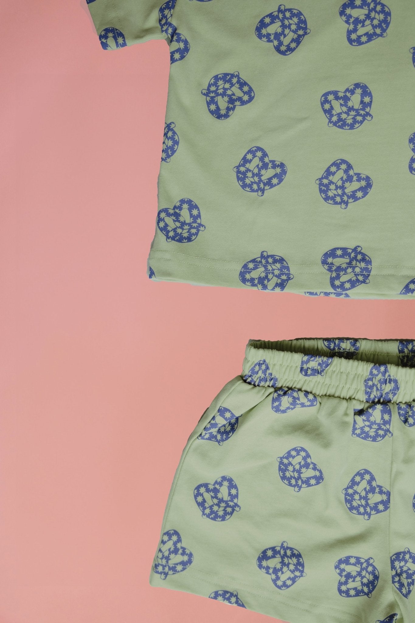 Pretzel Short Sleeve Set for Toddlers, this two-piece set includes a short-sleeve boxy tee and matching elastic-waist shorts, made from 100% cotton that’s soft, breathable, and easy to move in. The light green fabric is printed with a hand-drawn pretzel design in blue — fun, but not over the top.