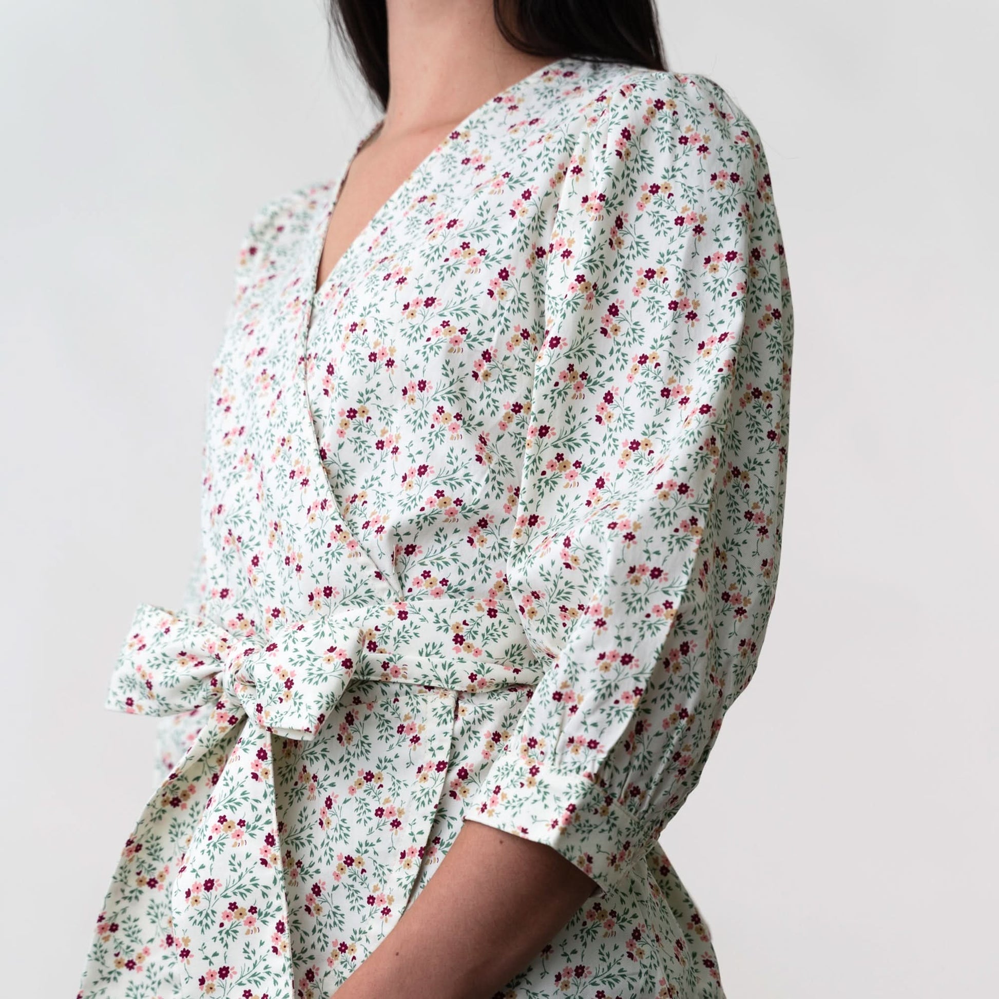 Our flattering wrap top combines a pretty sash with crisp cuffed sleeves for a beautiful feminine look. Features a gently curved hem, removable sash, full sleeves, hidden closures, and elastic at the back waist for the perfect fit.